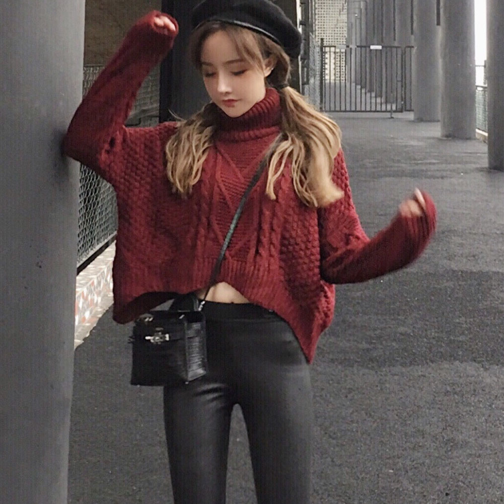 / 復古女神套裝秋冬高領麻花毛衣+高腰加絨外穿打底皮褲長褲兩件套
