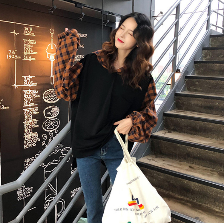 / 秋季女裝韓版中長款原宿風寬松格子拼接長袖連帽套頭衛衣上衣外套