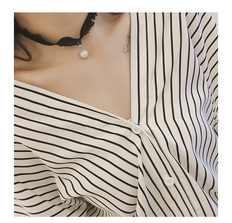 春秋裝新款女裝韓版修身條紋學生打底襯衣女前后V領露背中袖襯衫