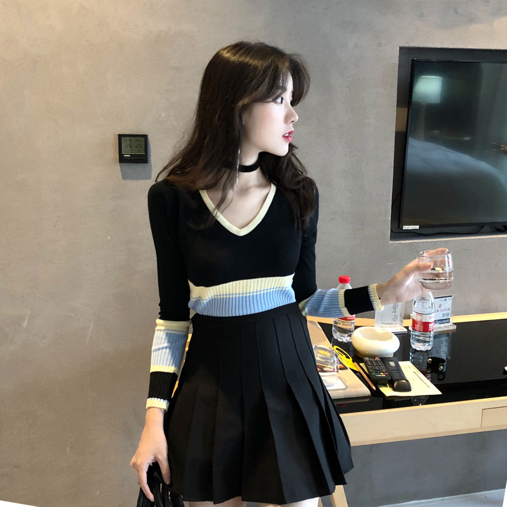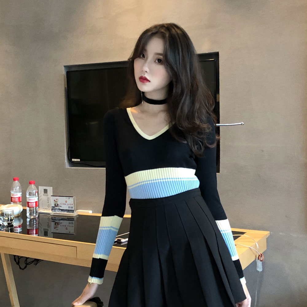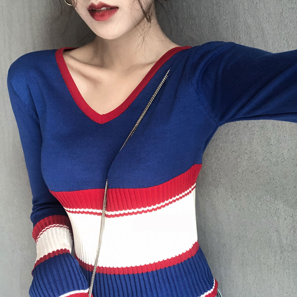 港味復古chic新款v領撞色條紋針織衫毛衣修身顯瘦打底衫上衣女潮