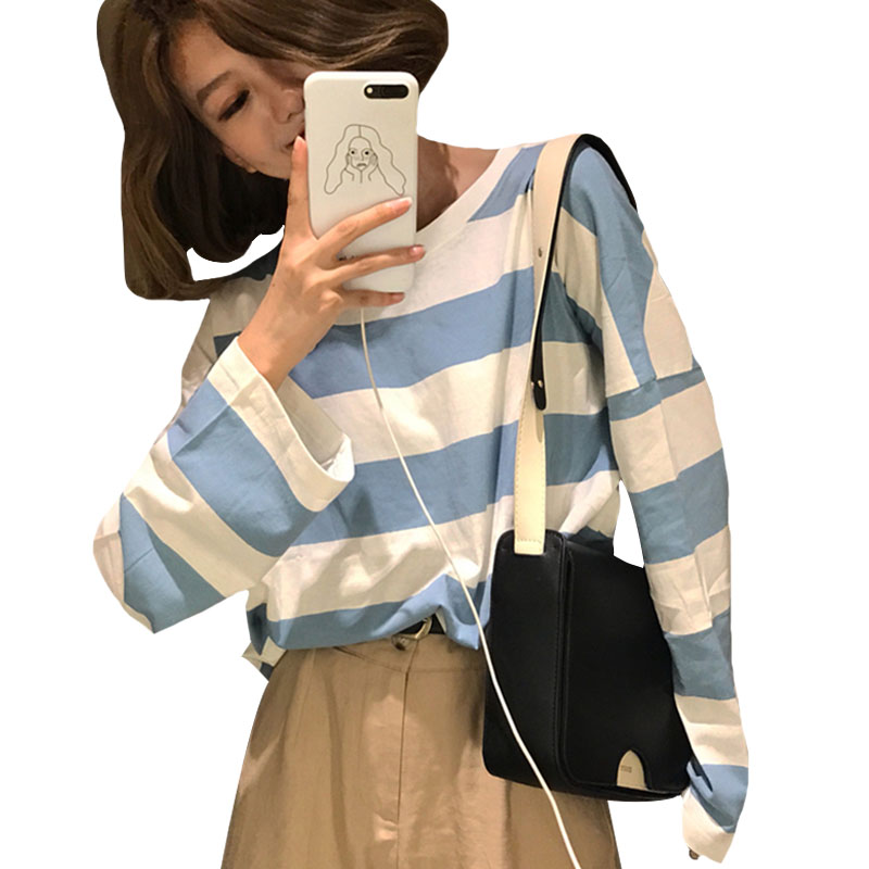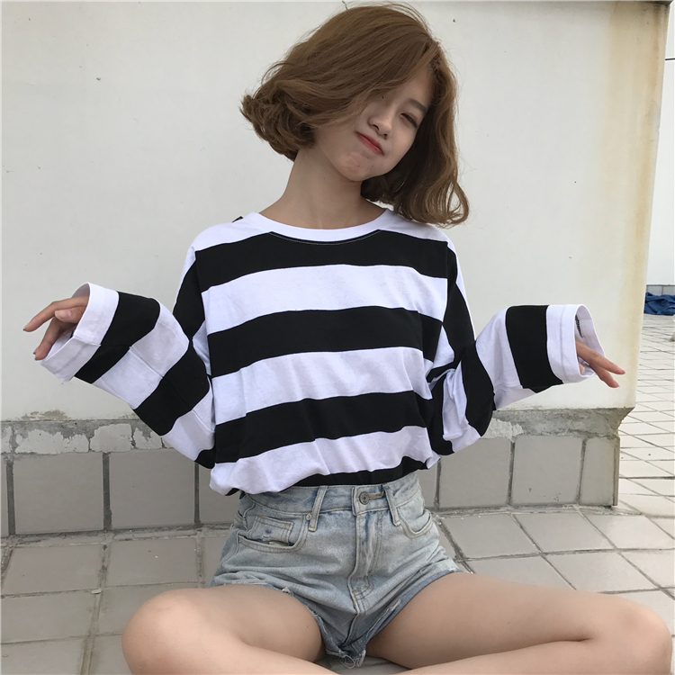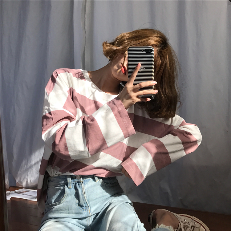 秋裝女裝韓版寬松百搭顯瘦拼色條紋T恤學生長袖休閑顯瘦體恤上衣