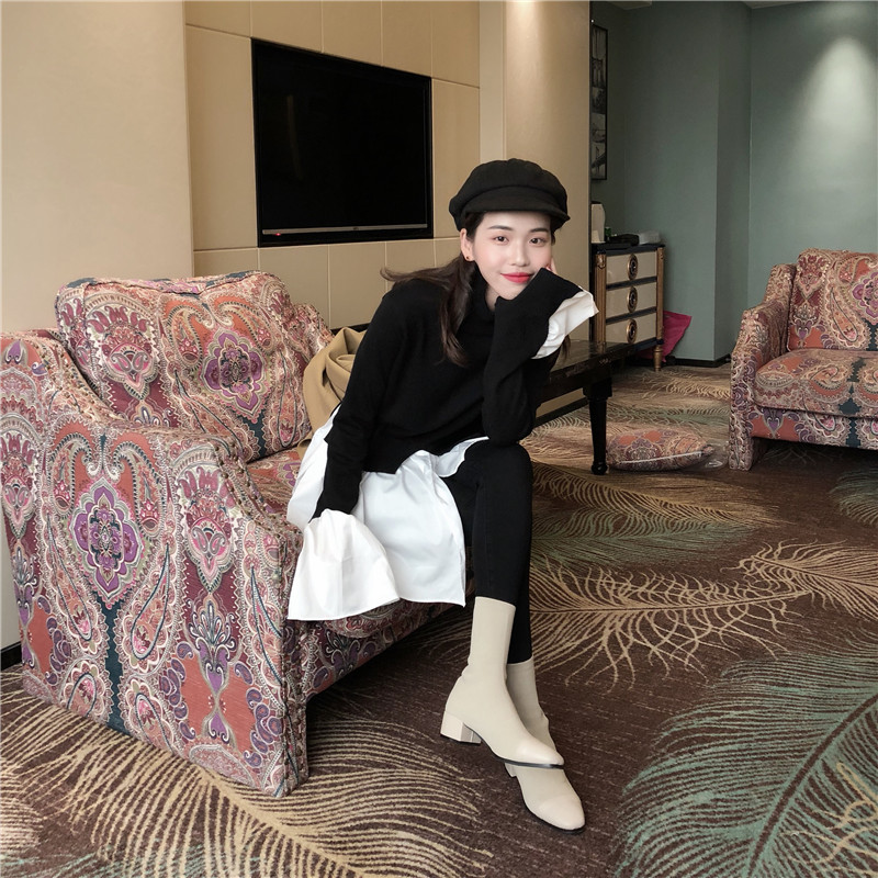 毛衣女2018新款時尚韓版氣質高領百搭襯衫拼接前短后長假兩件上衣