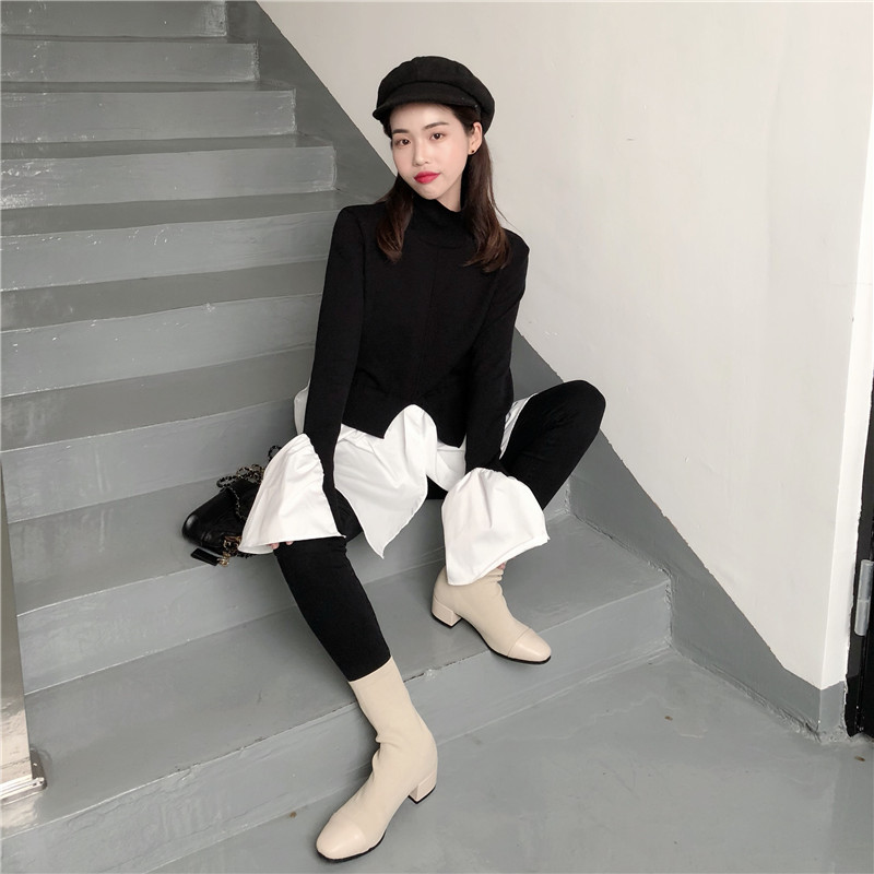 韓版毛衣女2018新款假兩件拼色半高領不規則喇叭袖襯衫針織衫上衣