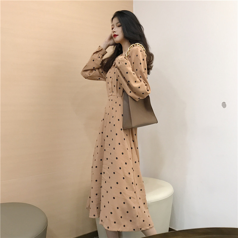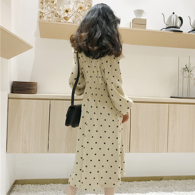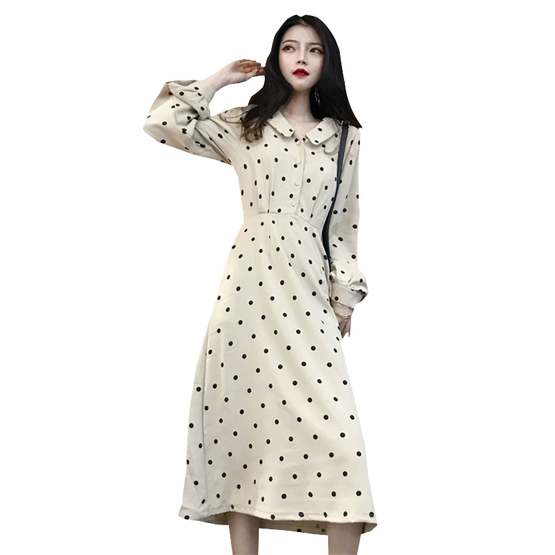 / 法式少女茶歇長袖連衣裙女 chic早秋裙收腰娃娃領波點連衣裙秋裝