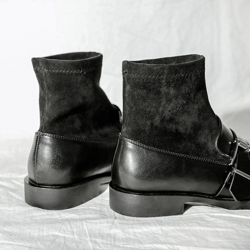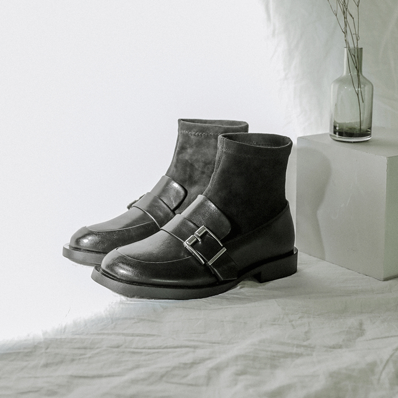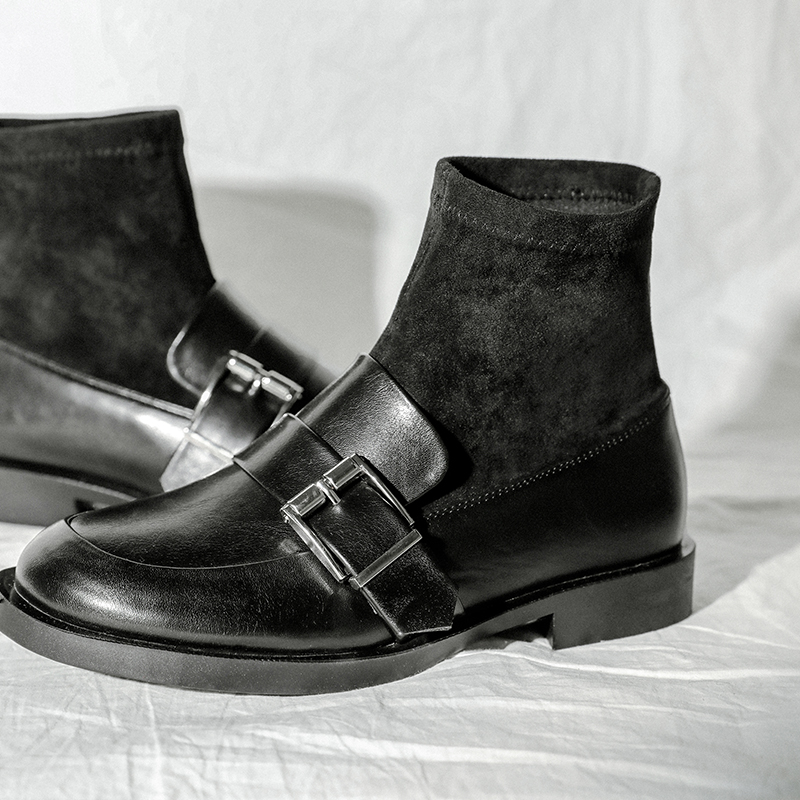 MG小象秋冬黑色短靴女2018新款個性粗跟襪子靴時尚圓頭平底鞋子潮