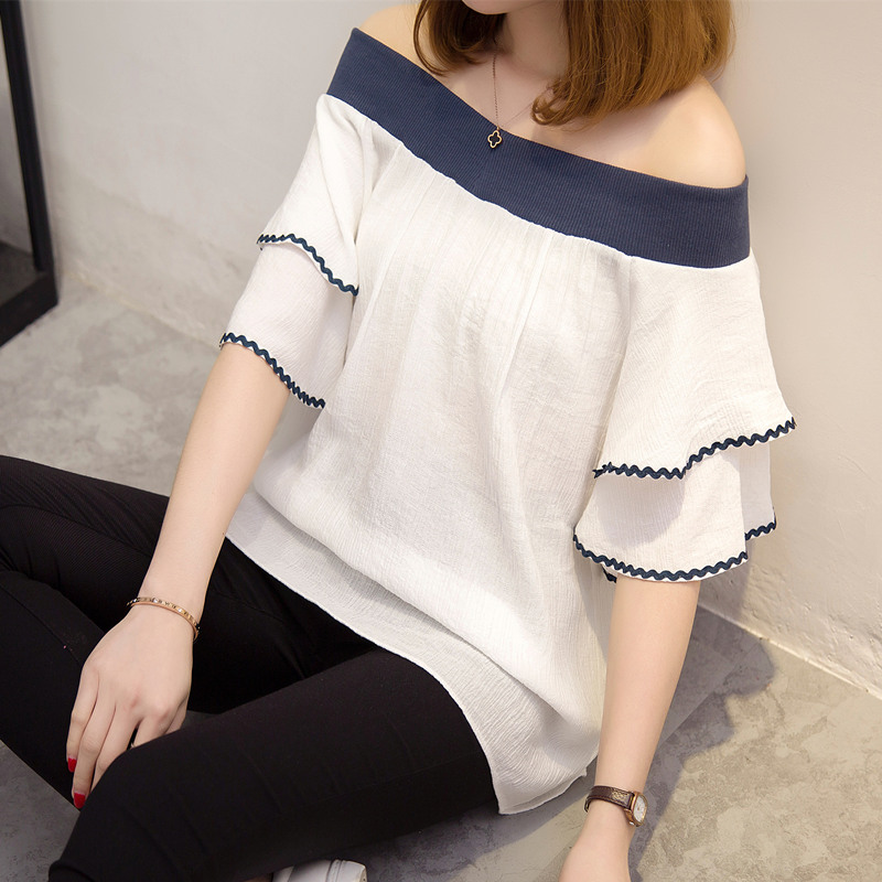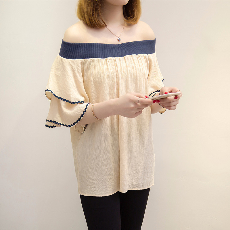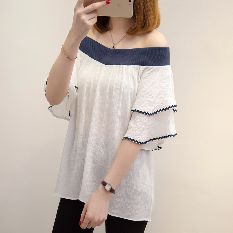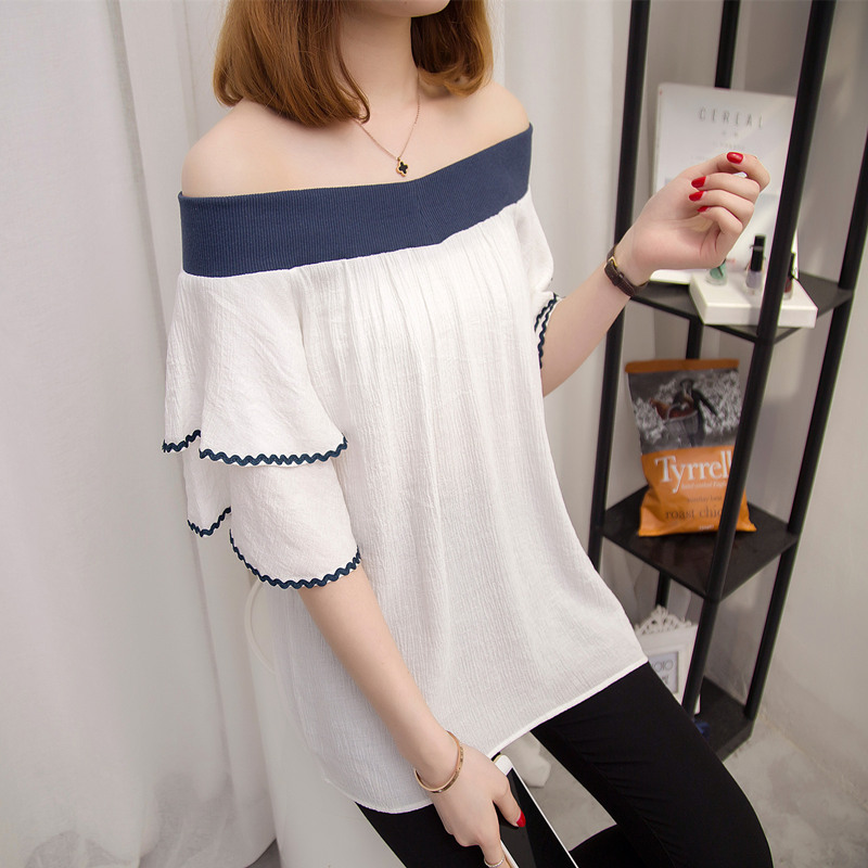 / 短袖一字領上衣女夏新款露肩雪紡白色t恤女短袖韓版寬松百搭