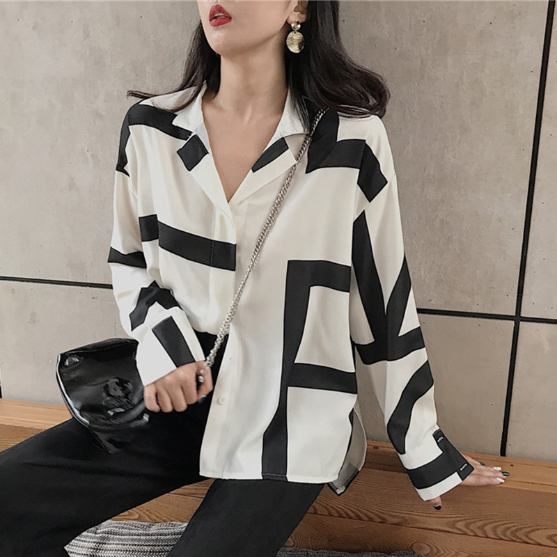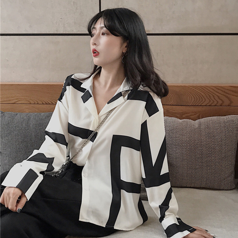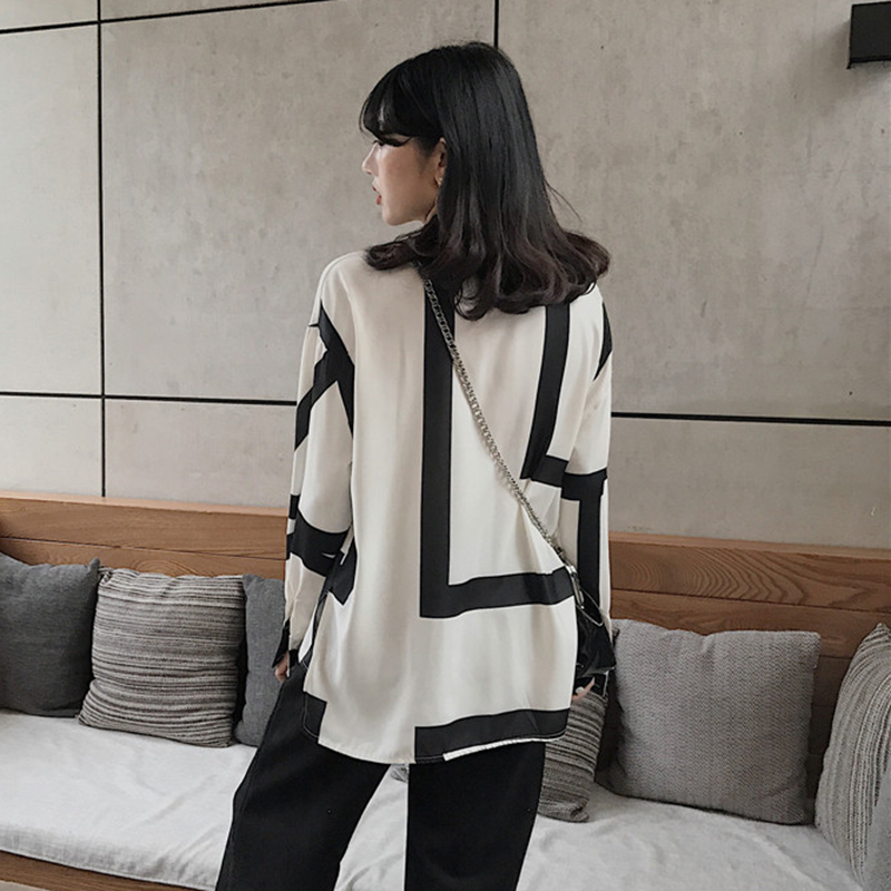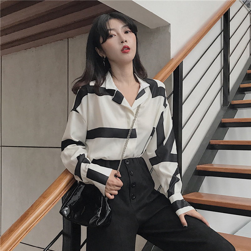 / 港風不規則條紋襯衫秋裝女2018新款寬松長袖上衣學生翻領休閑襯衣