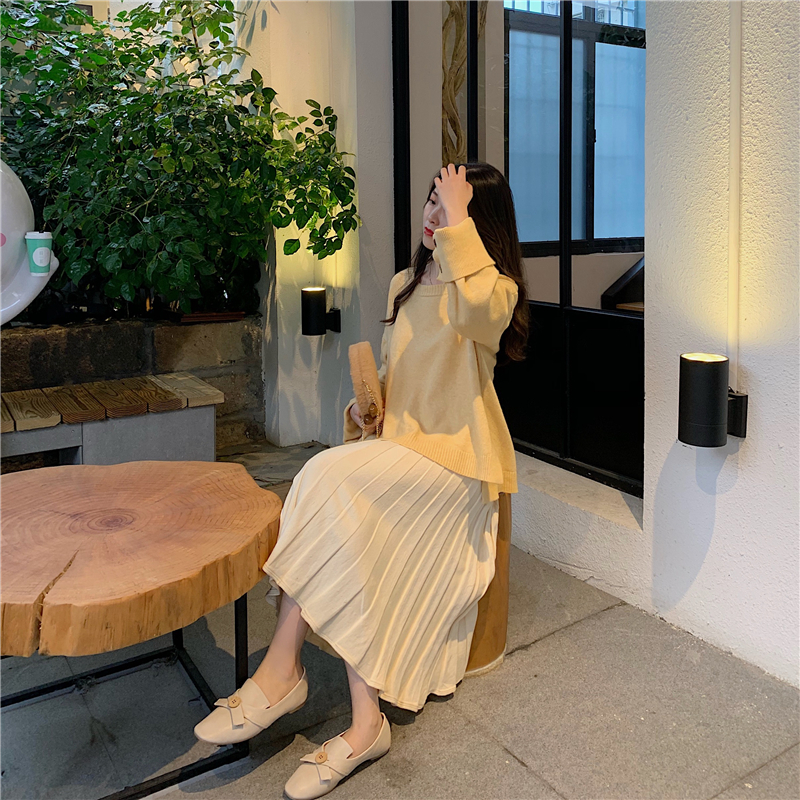 / 慵懶風寬松毛衣女套頭長袖針織衫上衣+中長款高腰百褶半身裙套裝