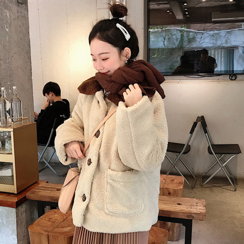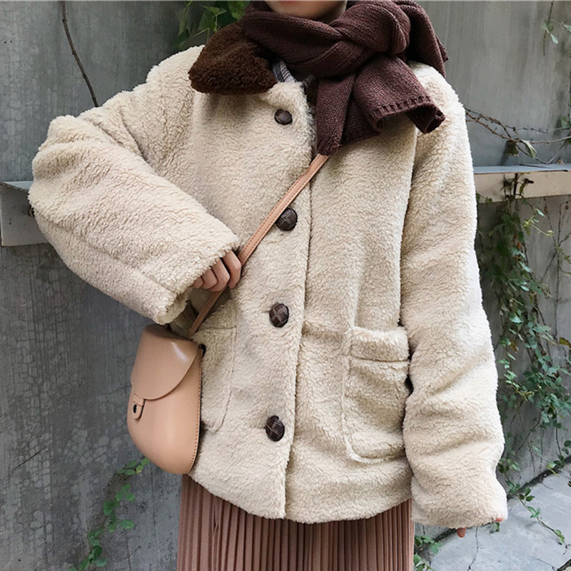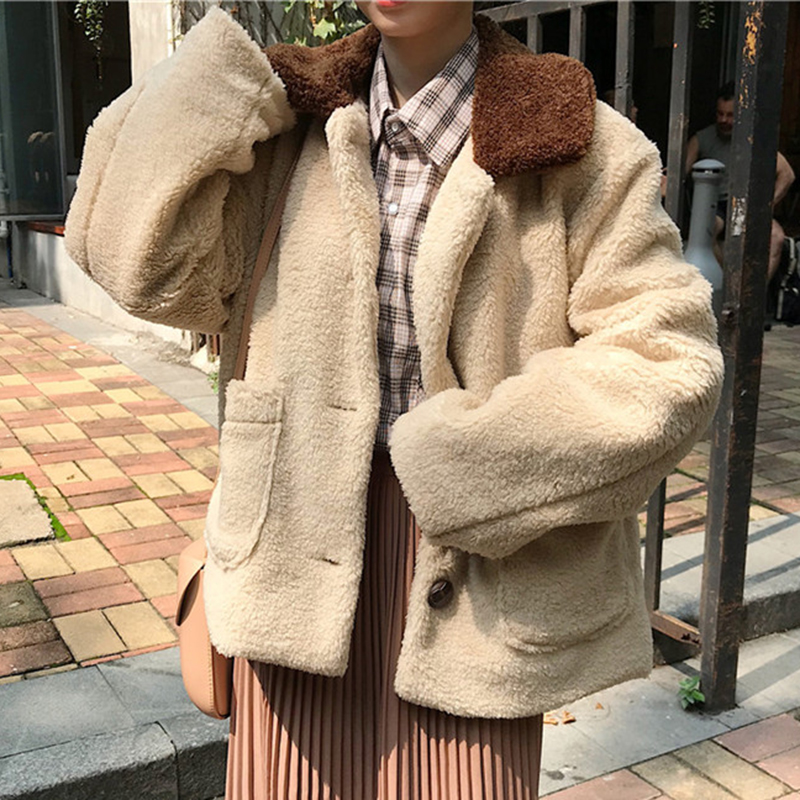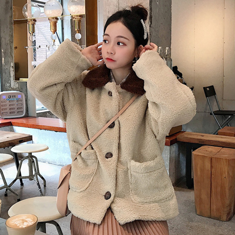 / 羊羔毛棉襖2018冬季女裝新款拼色翻領長袖外套學生寬松休閑棉衣服