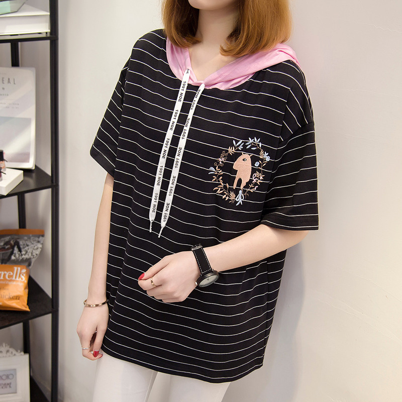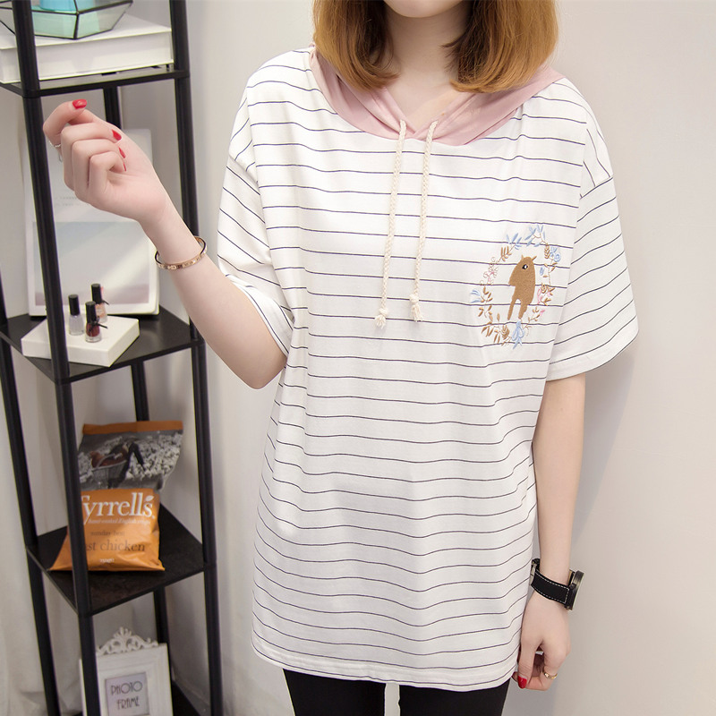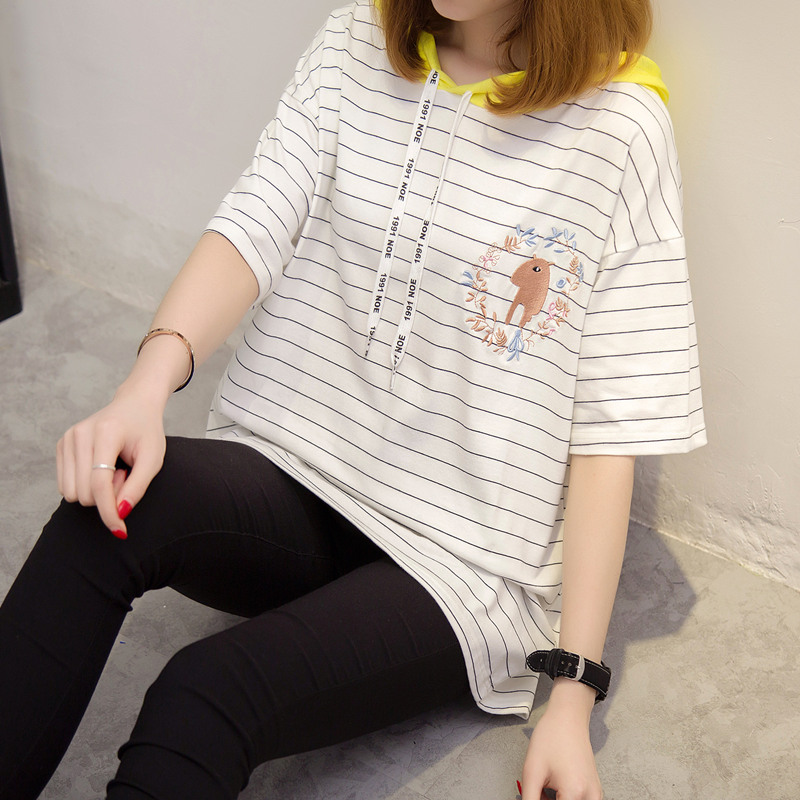 / 條紋連帽t恤女韓版薄款休閑體恤衫中長款上衣女夏新款女裝潮