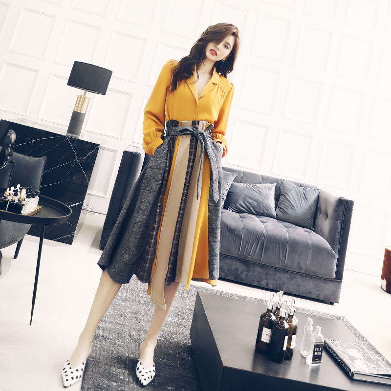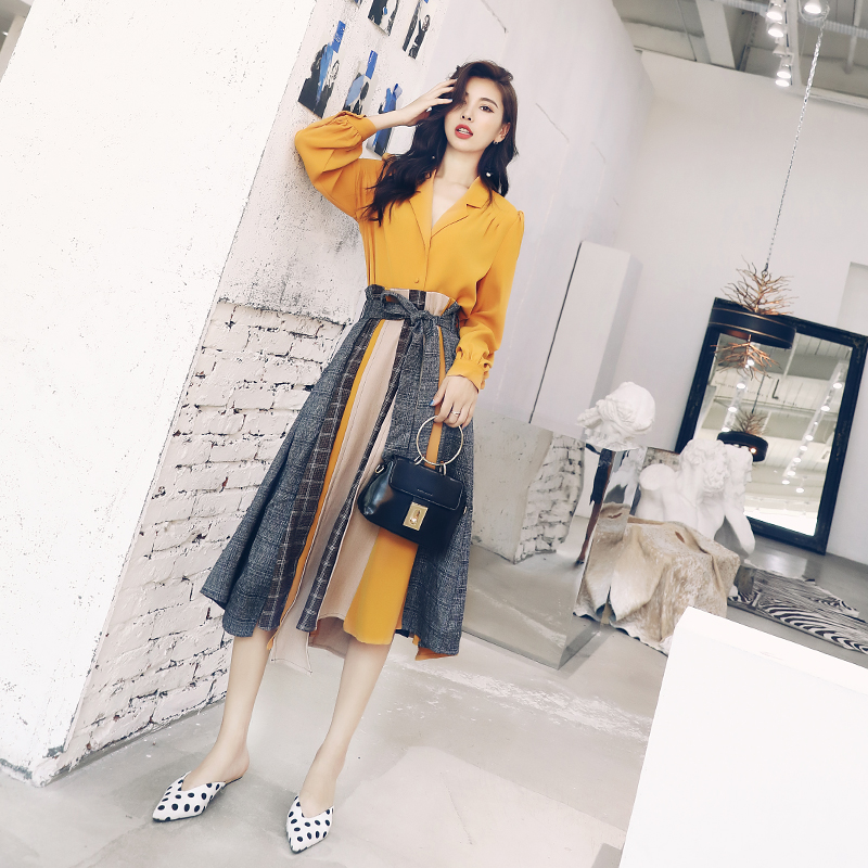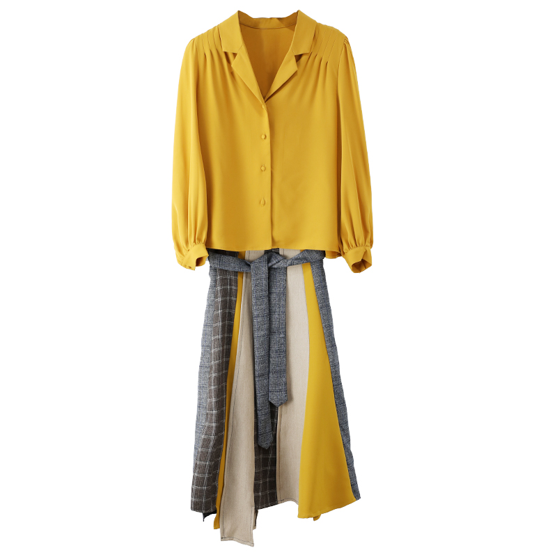 / 秋季新款長袖襯衫上衣名媛氣質高腰顯瘦拼接中長款半身裙時尚套裝