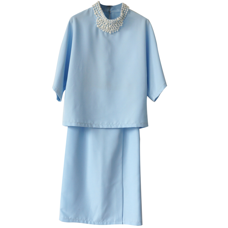 s秀名媛氣質2018夏新款釘珠五分袖寬松上衣開衩半裙純色兩件套裝