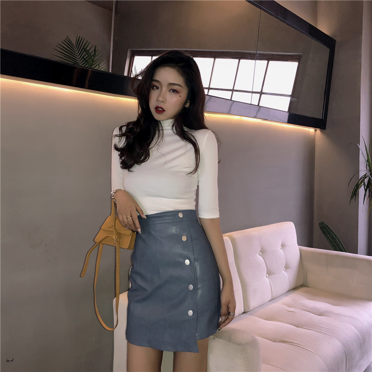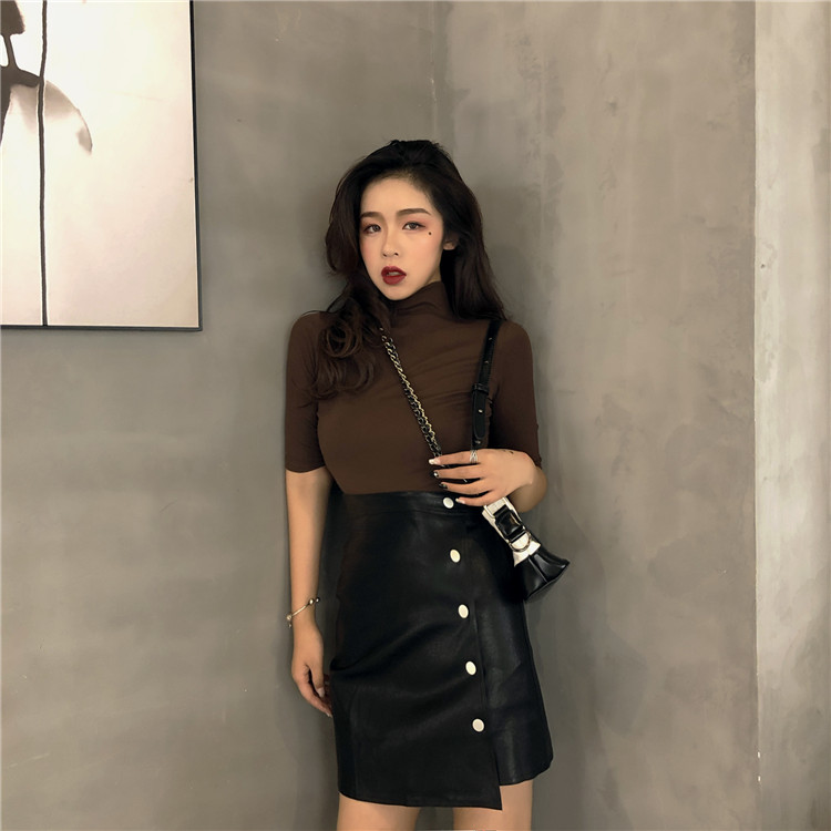 早秋新款基礎純色半高領T恤+高腰顯瘦皮短裙套裝分開拍