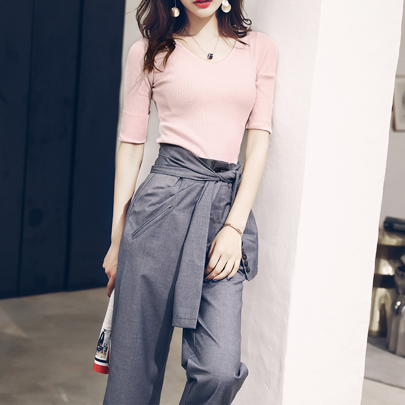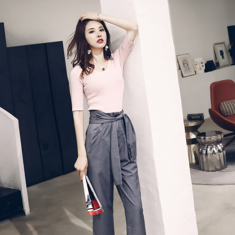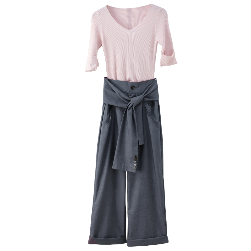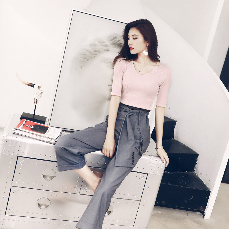 / 2018秋季時尚氣質韓版休閑套裝針織上衣高腰系帶九分闊腿褲兩件套