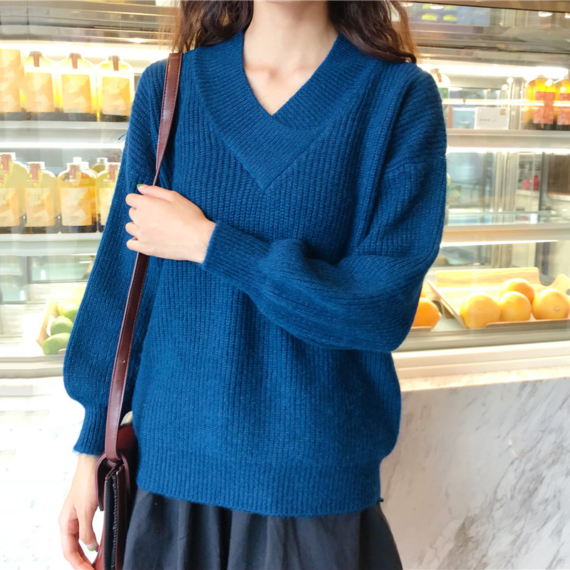 慵懶風套頭毛衣外套女秋冬裝2018新款韓版百搭寬松V領長袖針織衫