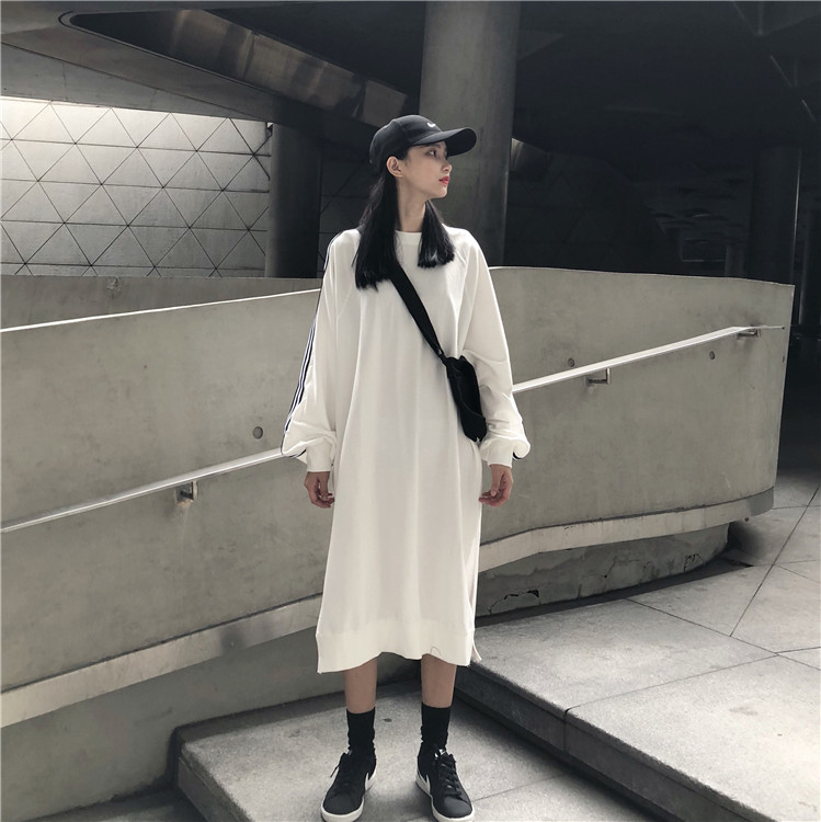 / 秋季女裝韓版中長款慵懶風寬松顯瘦側開叉條紋長袖套頭連衣裙長裙