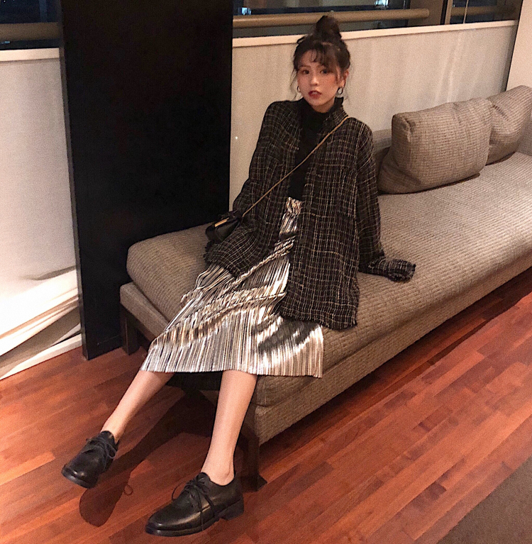 壓褶裙很搶眼哦 版型很修飾身材 穿上整體效果灰長修長