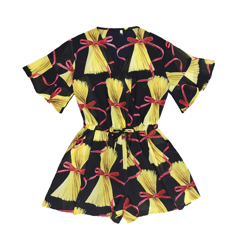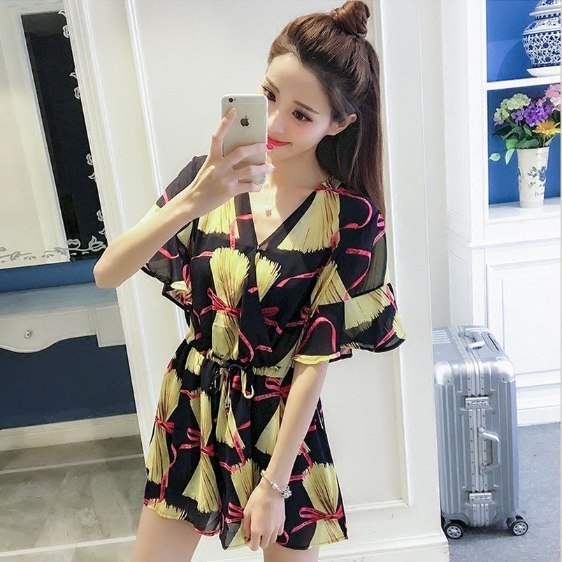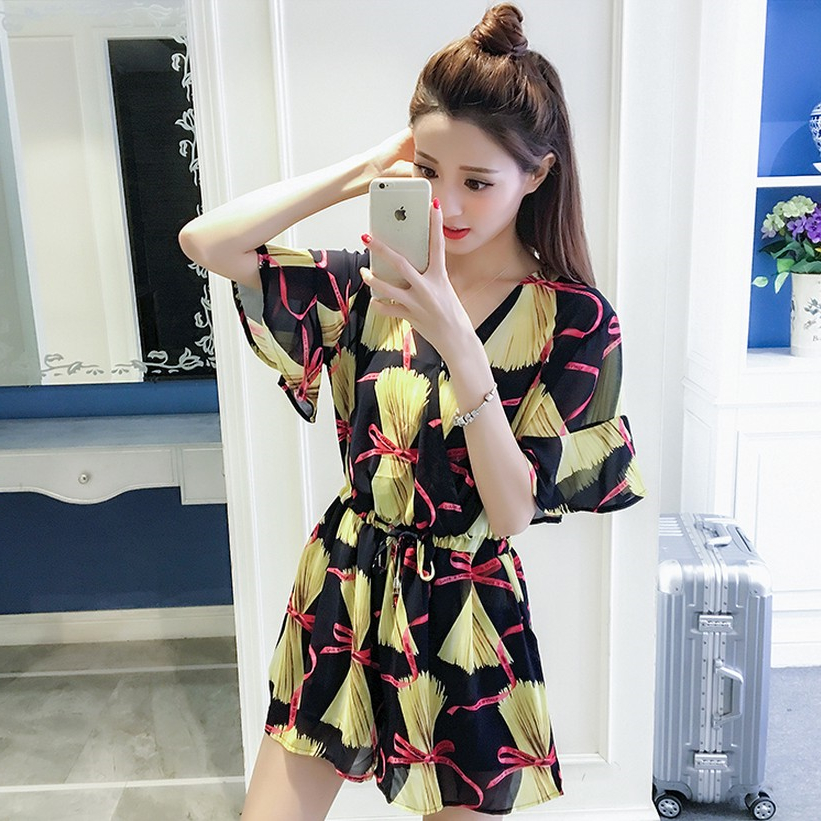 / 夏季新款寬松V領雪紡連體短褲復古名媛氣質碎花時尚連衣裙女