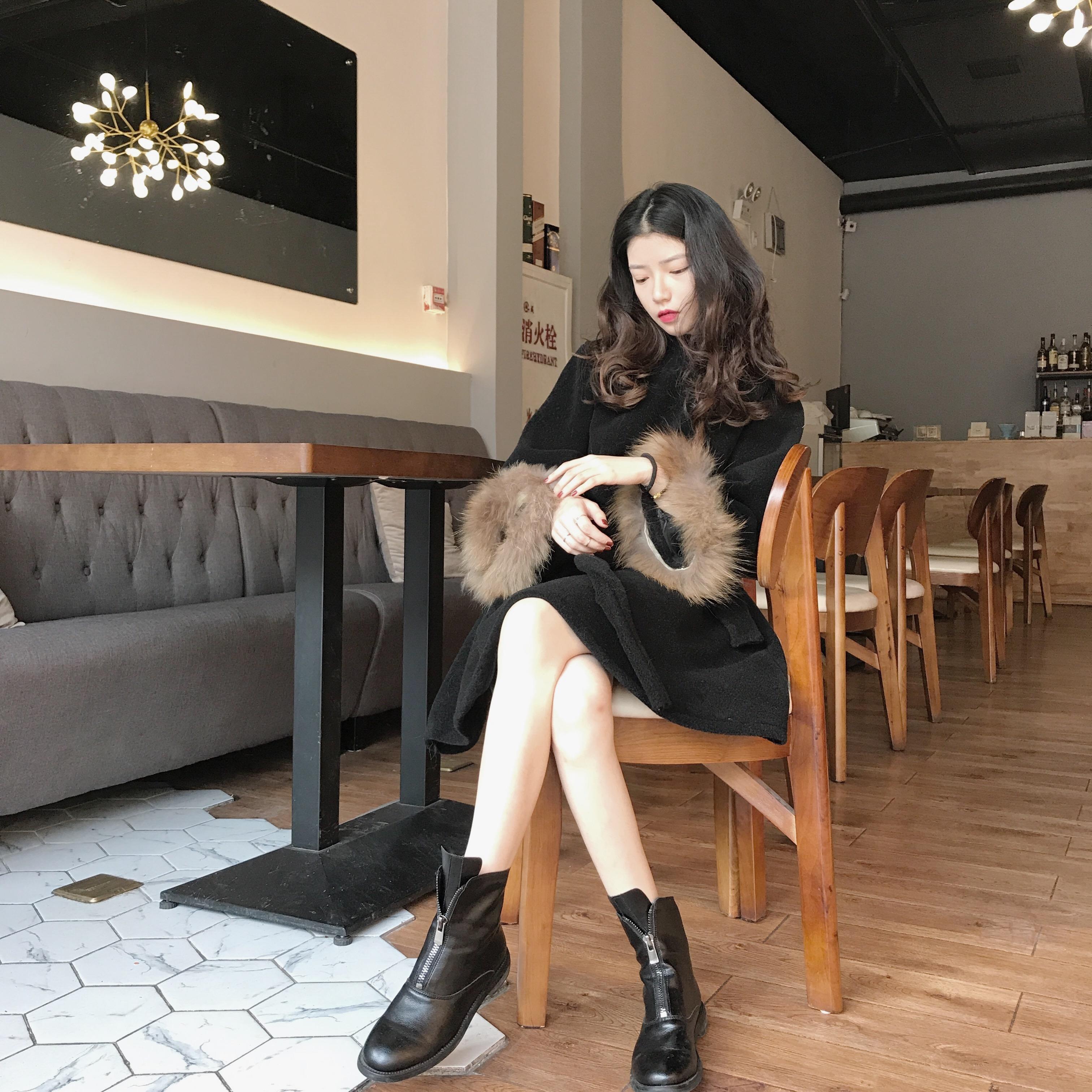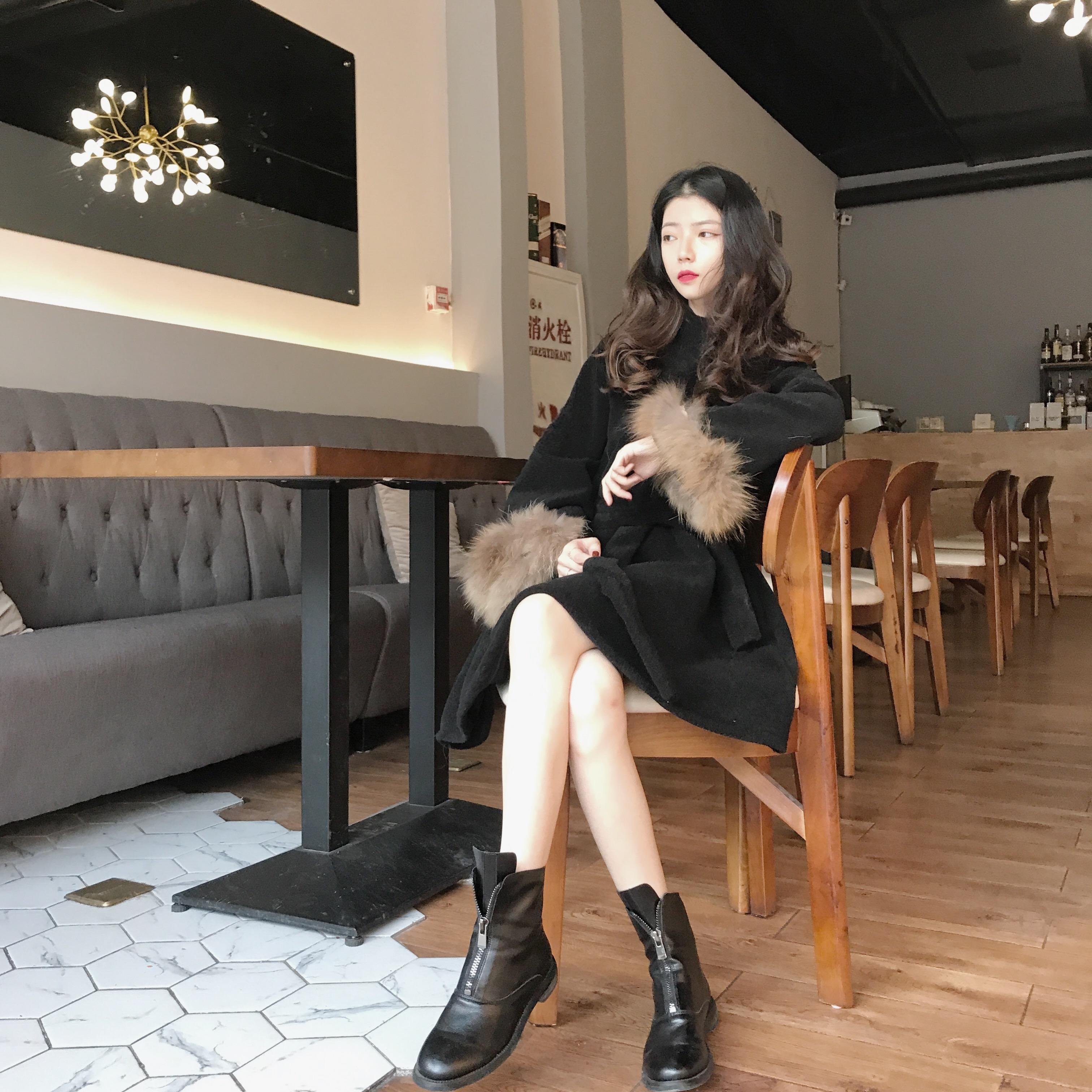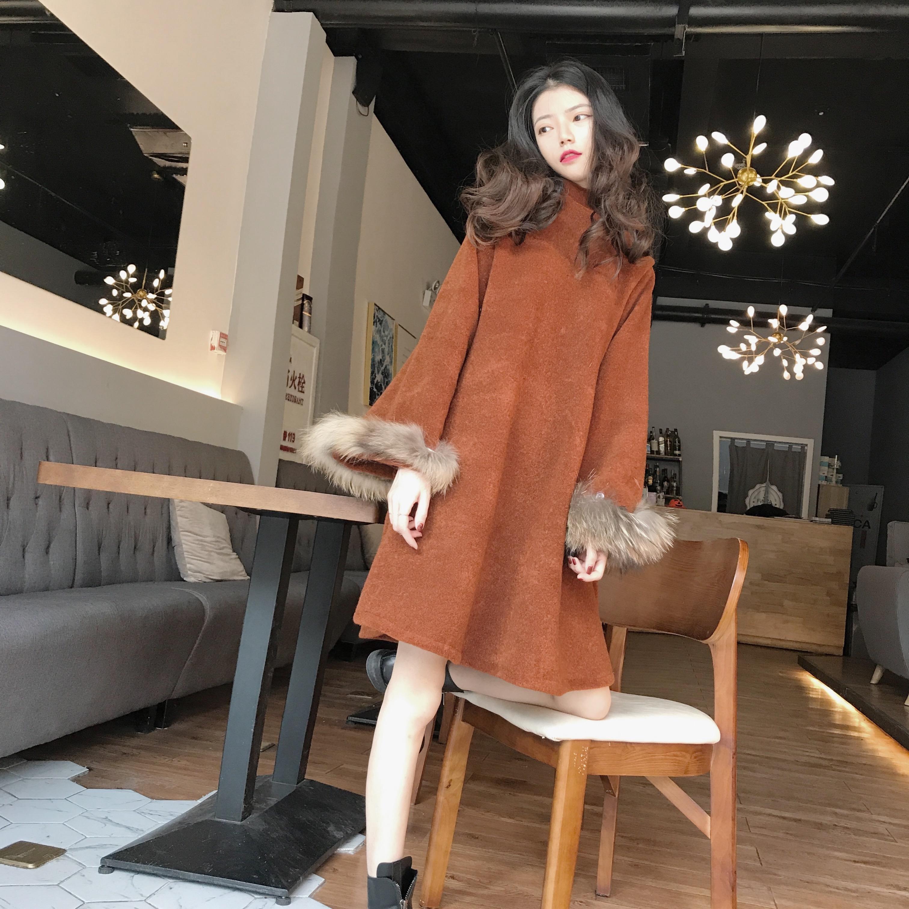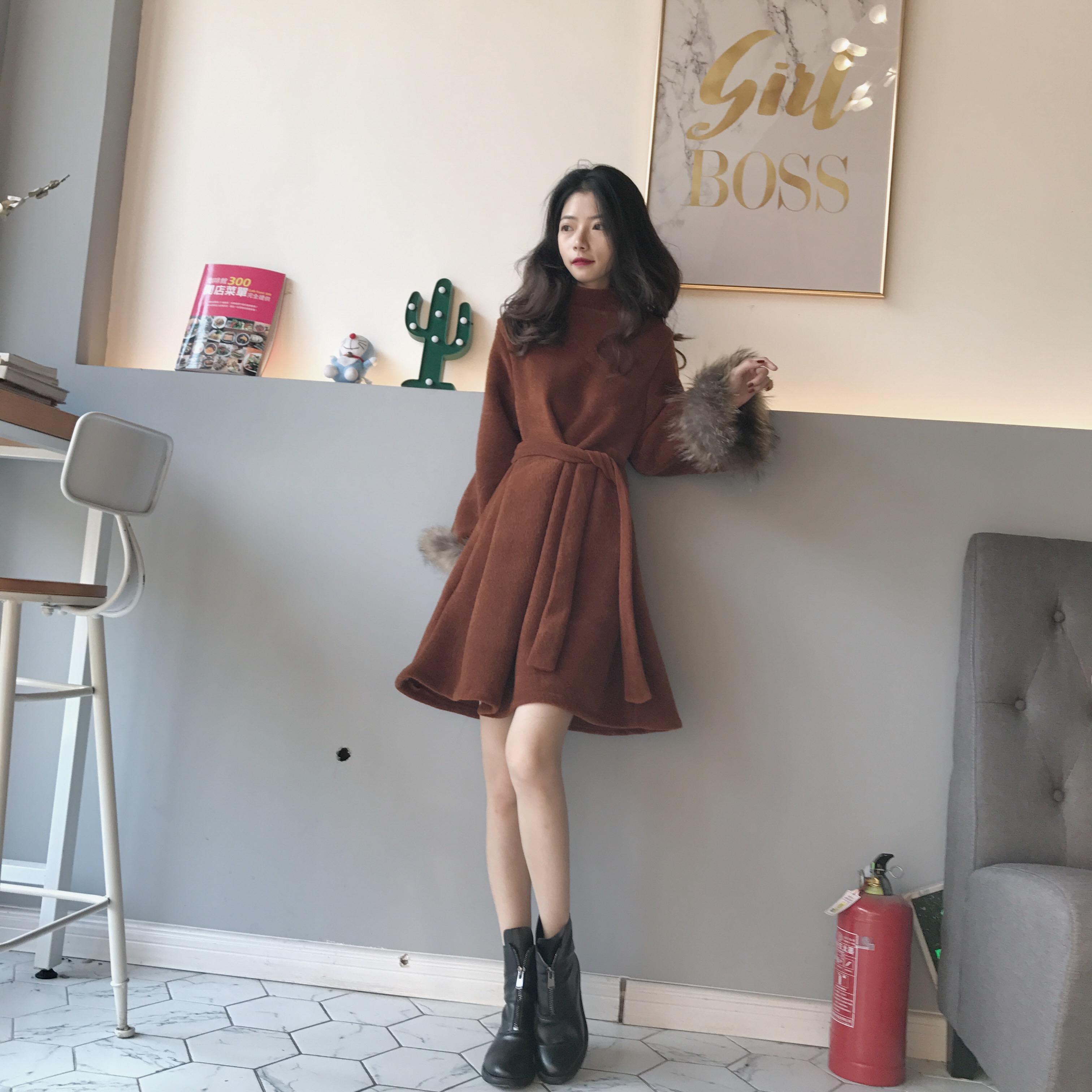 / 2018新款秋冬毛呢連衣裙袖口帶毛毛百搭小香風時尚chic氣質中長裙