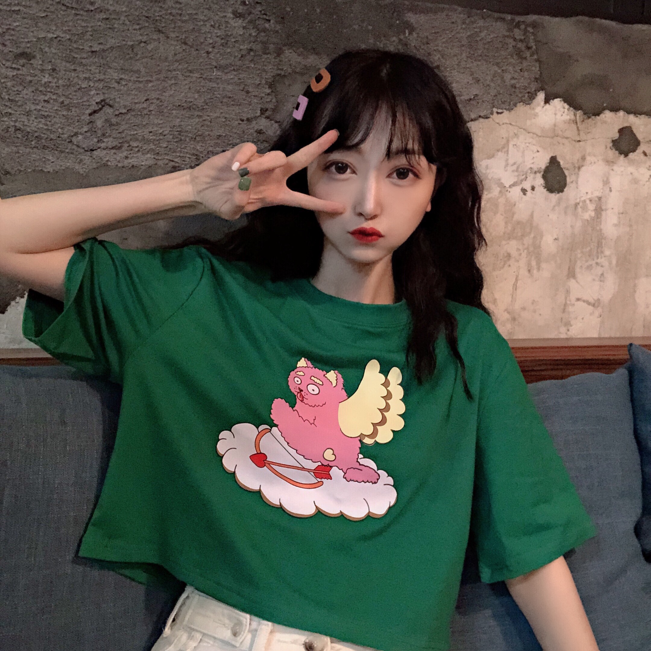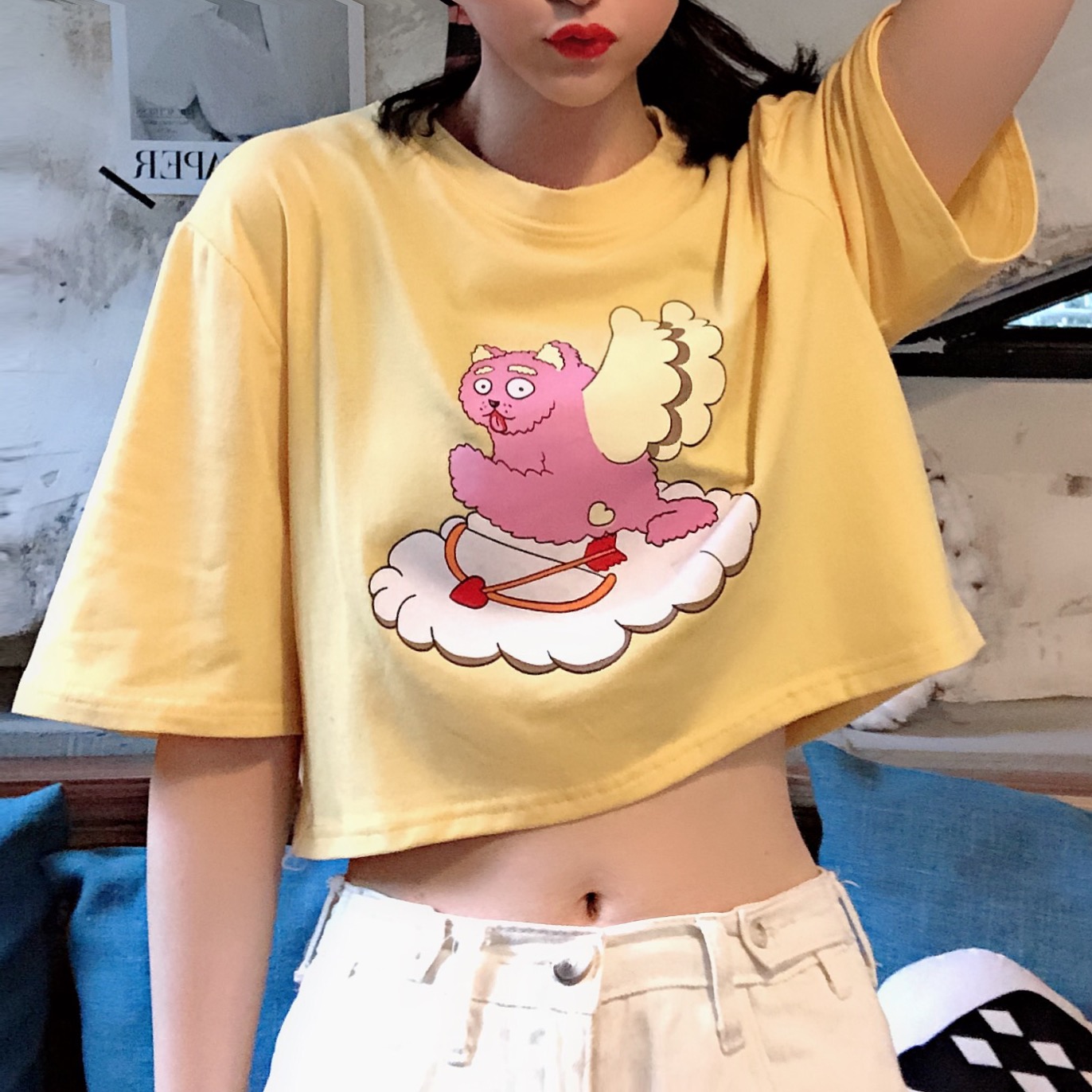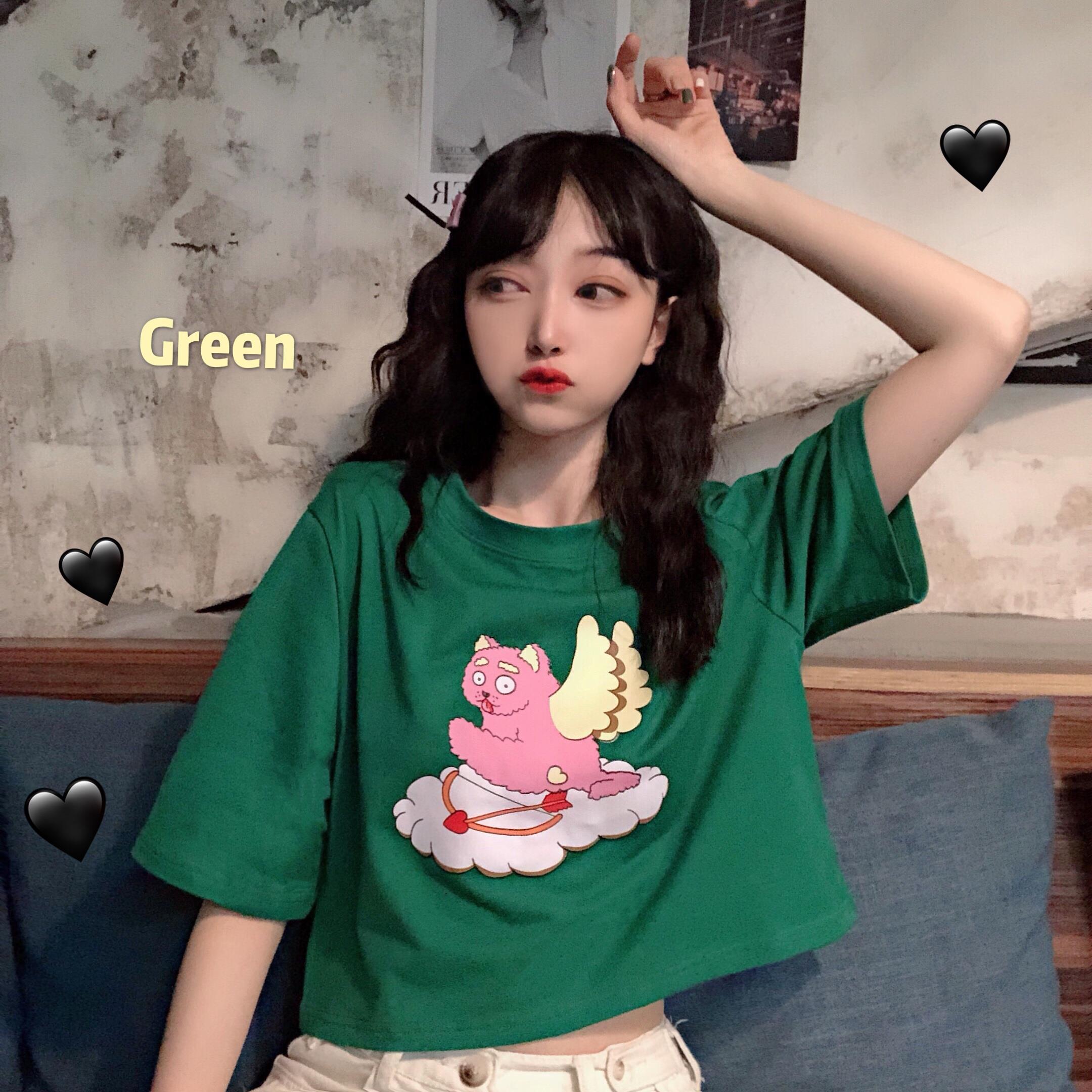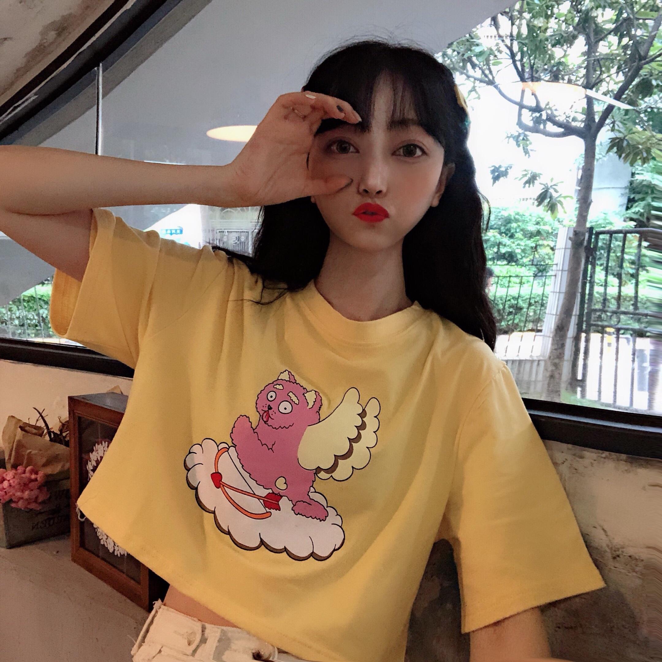 / 夢露日記/大Sim 網紅丘比特短款上衣女夏韓版學生可愛卡通印花T恤