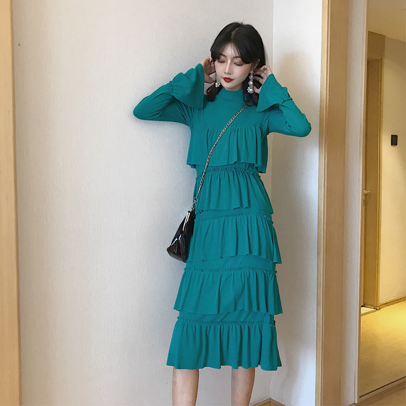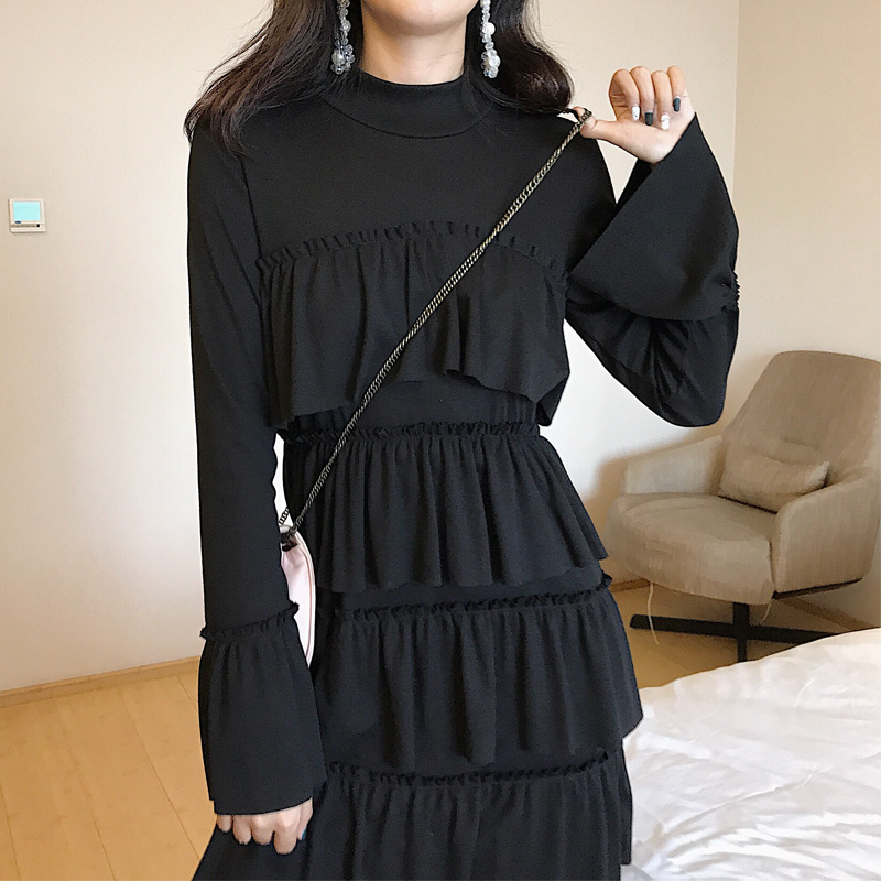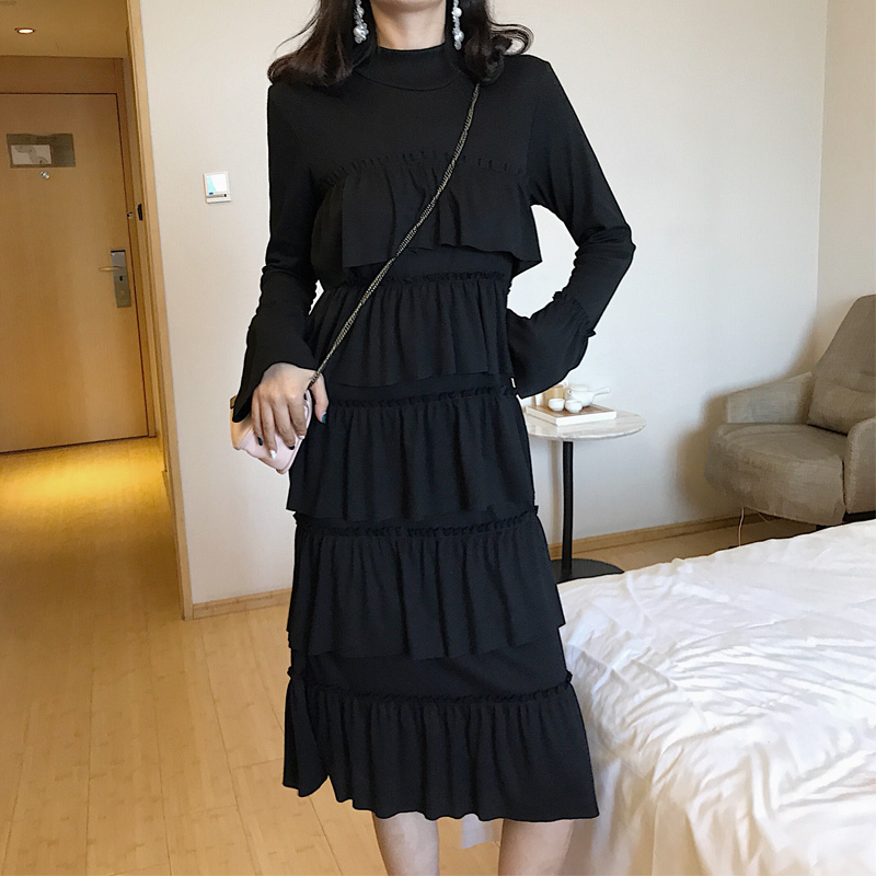 / 港味復古半高領喇叭袖層層蛋糕裙高腰連衣裙女甜美百搭chic中長裙