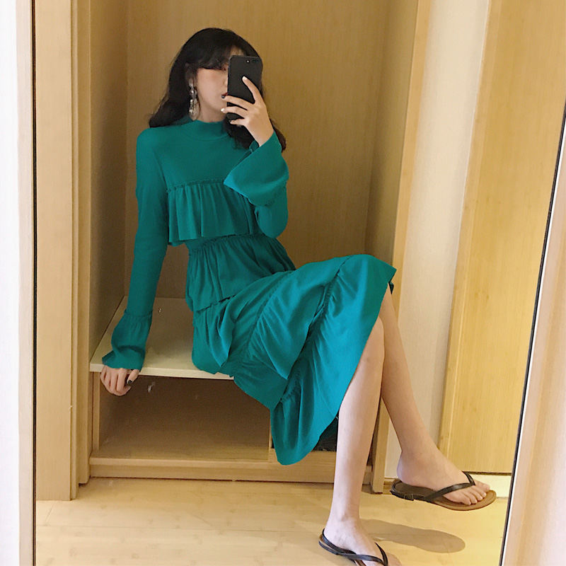 港味復古半高領喇叭袖層層蛋糕裙高腰連衣裙女甜美百搭chic中長裙