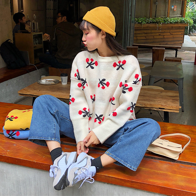 / 小清新毛衣外套女秋冬裝2018新款韓版學生寬松櫻桃提花長袖針織衫