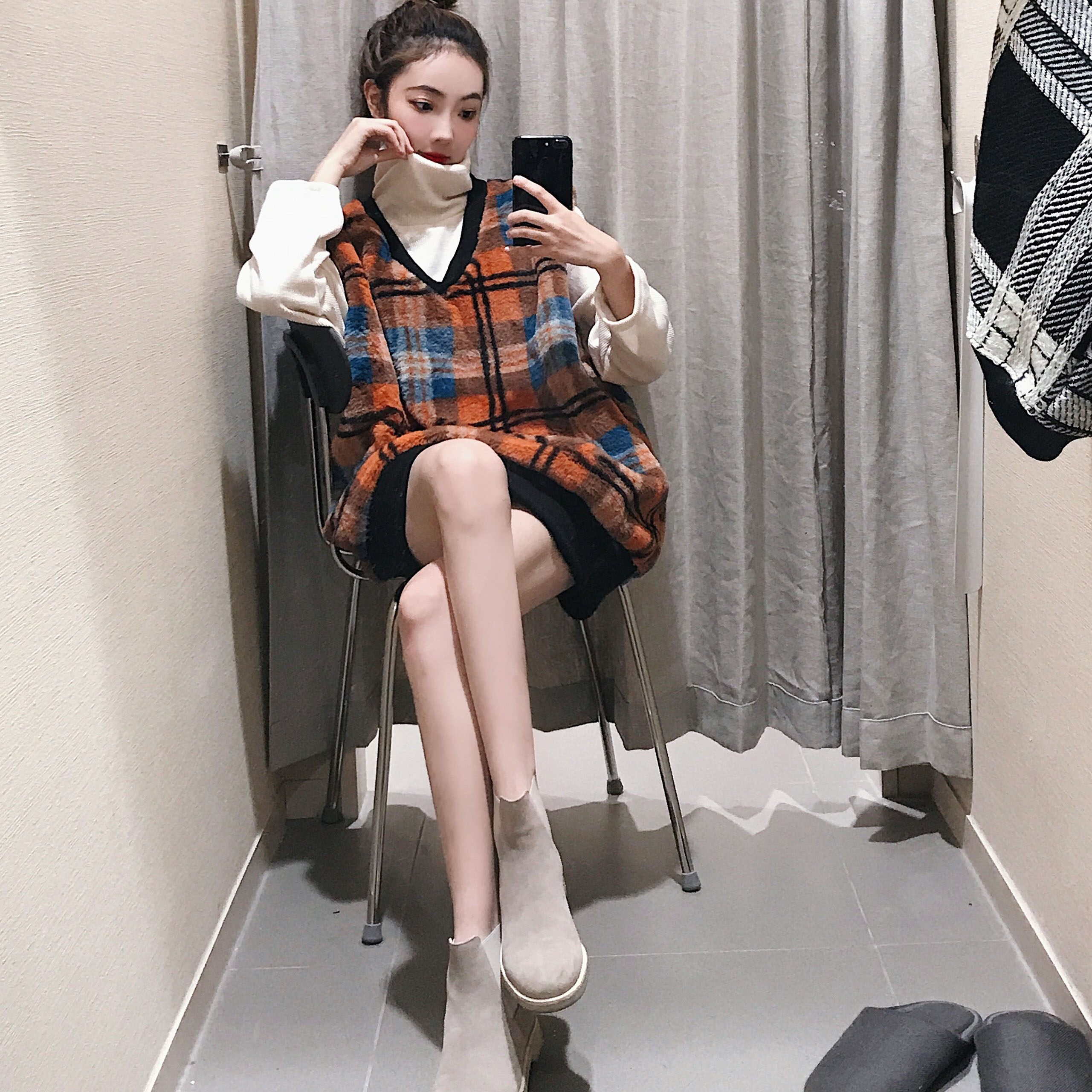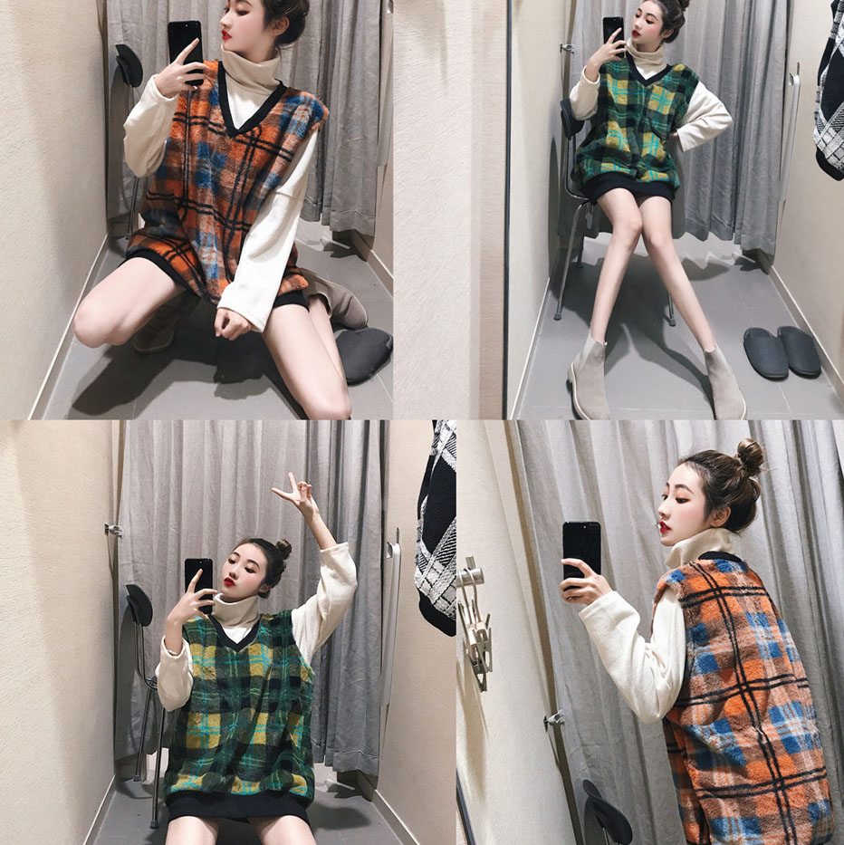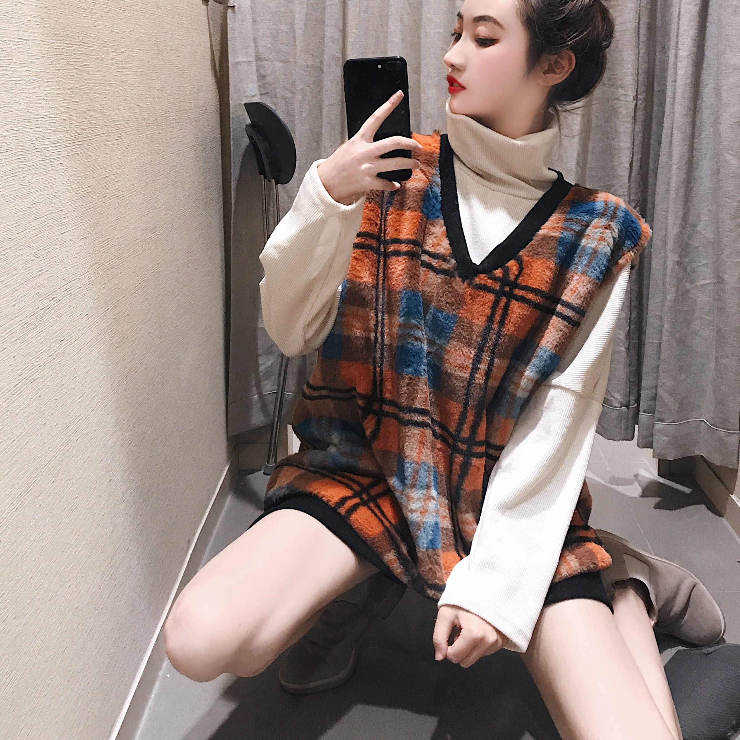 / 女神套裝秋冬款復古格子毛絨厚背心馬甲+高領中長款打底衫兩件套