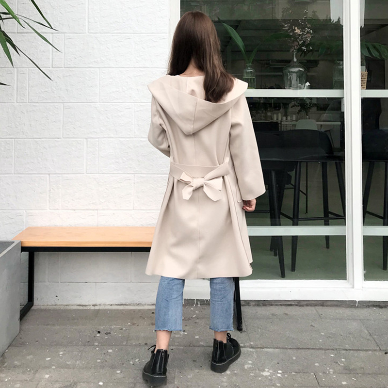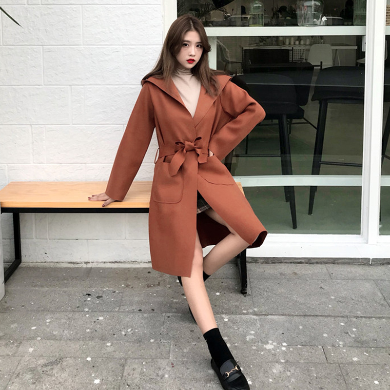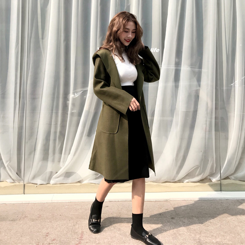 中長款流行呢子大衣女冬裝2018新款韓版寬松系帶收腰連帽毛呢外套