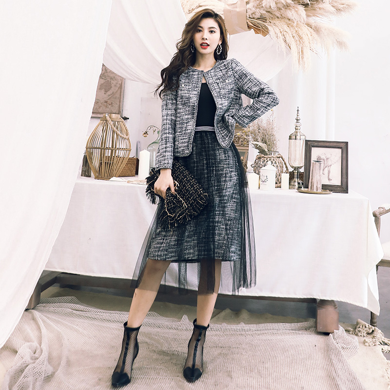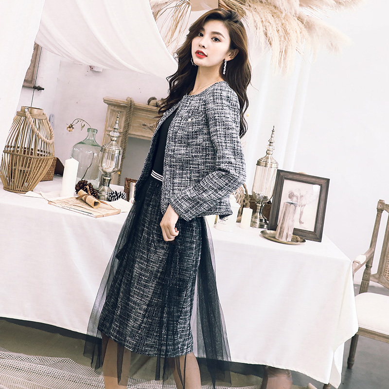 初秋兩件套女2018新款圓領外套網紗拼接半身裙氣質港風時尚套裝潮