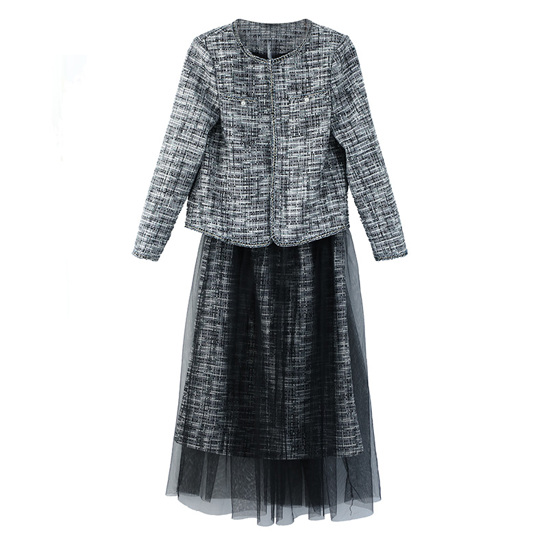 / 初秋兩件套女2018新款圓領外套網紗拼接半身裙氣質港風時尚套裝潮