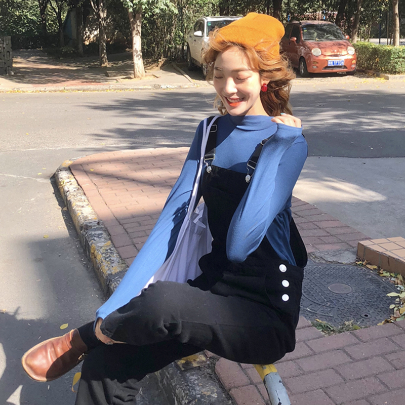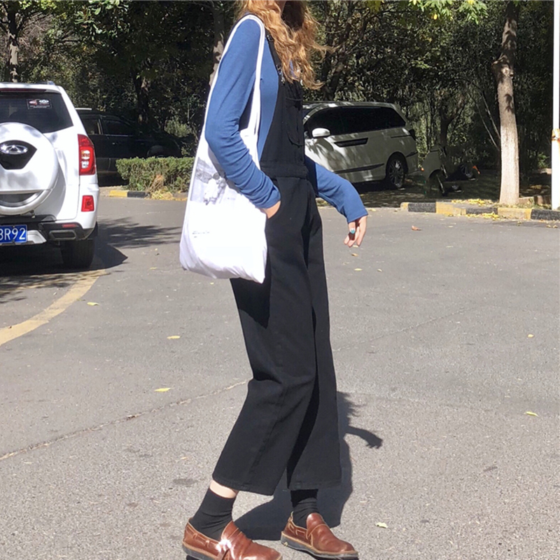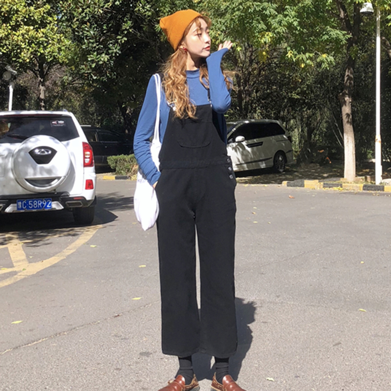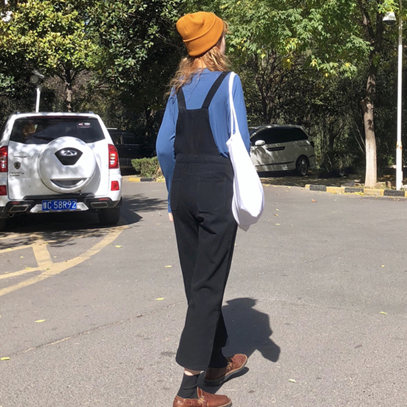 / 怪味少女黑色牛仔直筒褲子秋冬裝2018新款學生復古寬松背帶褲長褲