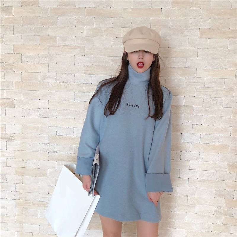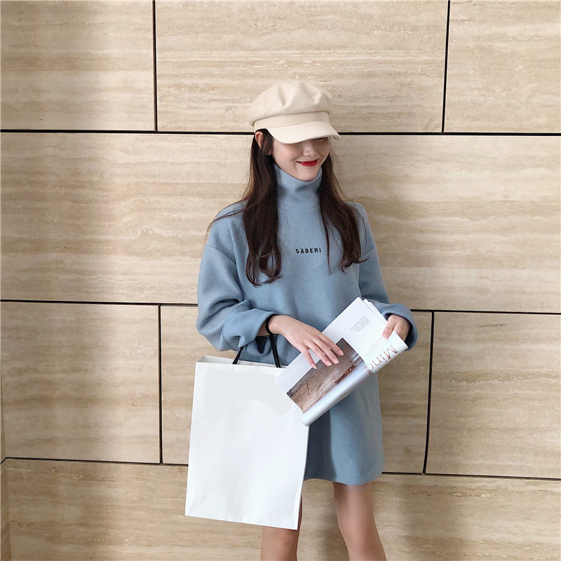 衛衣2018新款女長袖韓版寬松顯瘦oversize印花半高領慵懶長款裙子