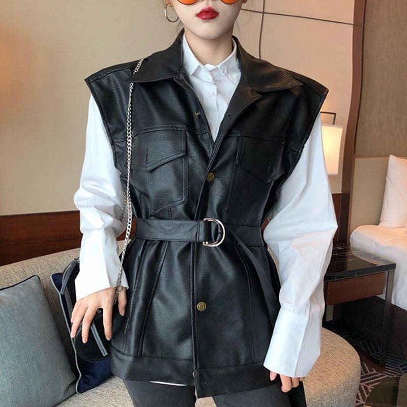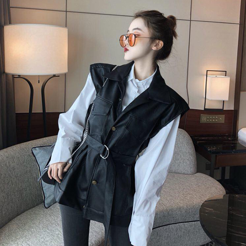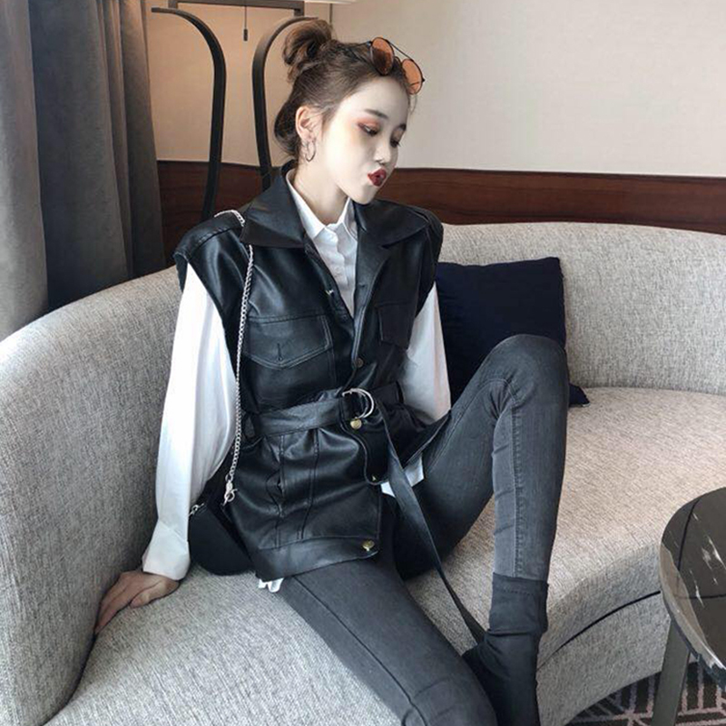 / 秋裝新款時尚網紅套裝女港風PU皮機車無袖馬甲寬松襯衫兩件套