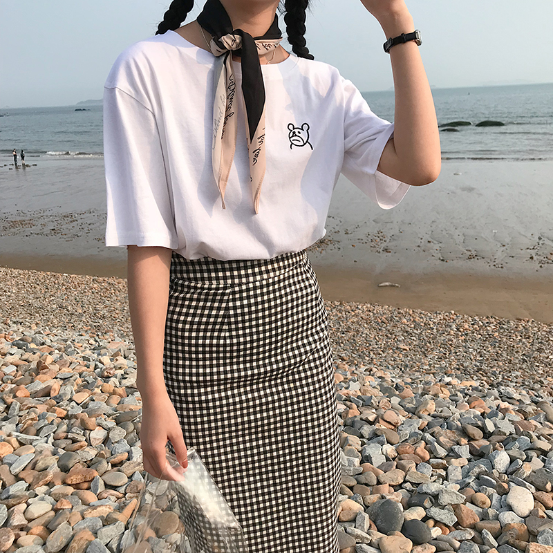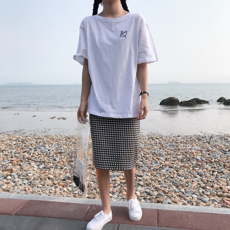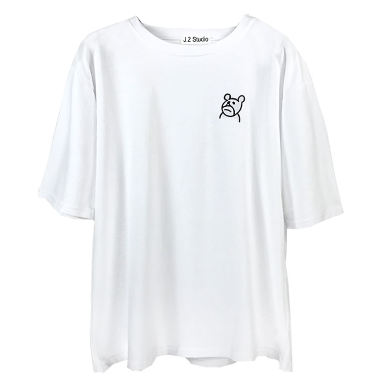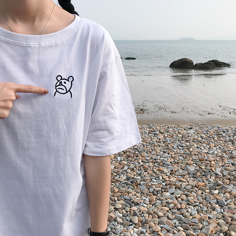 / 夏季新款女裝刺繡寬松顯瘦純色學生百搭圓領短袖t恤打底衫上衣女