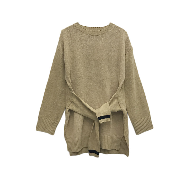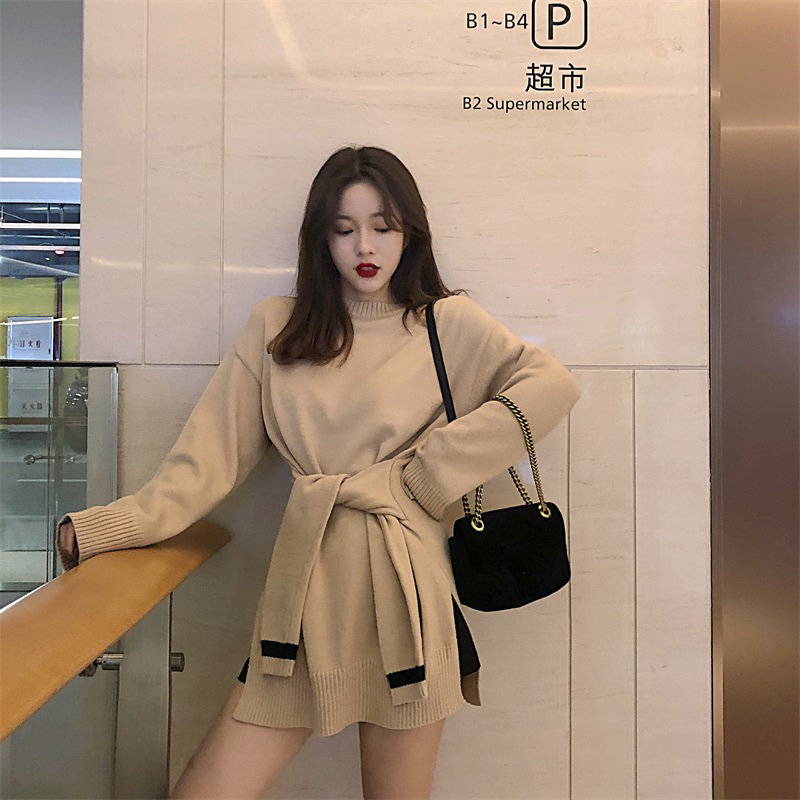 / 慵懶風毛衣女套頭修身顯瘦中長款圓領假兩件拼色打底毛衣連衣裙女