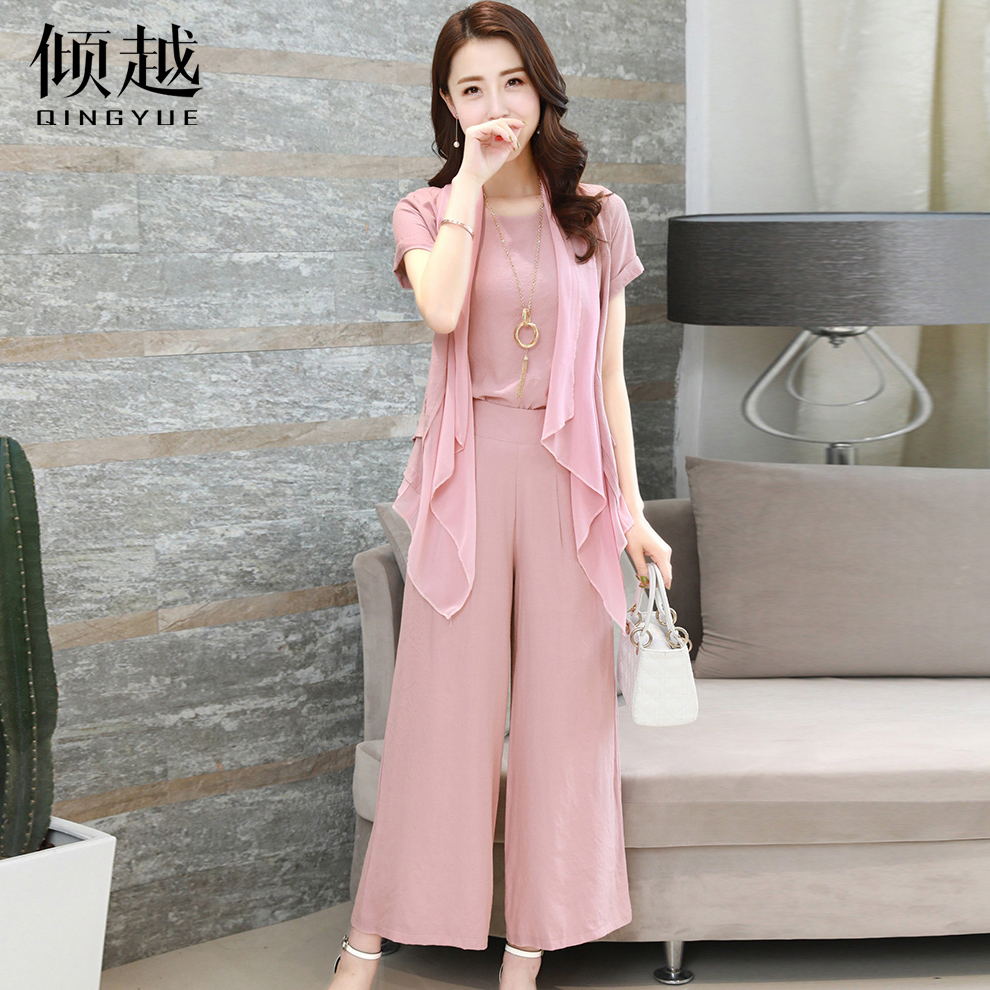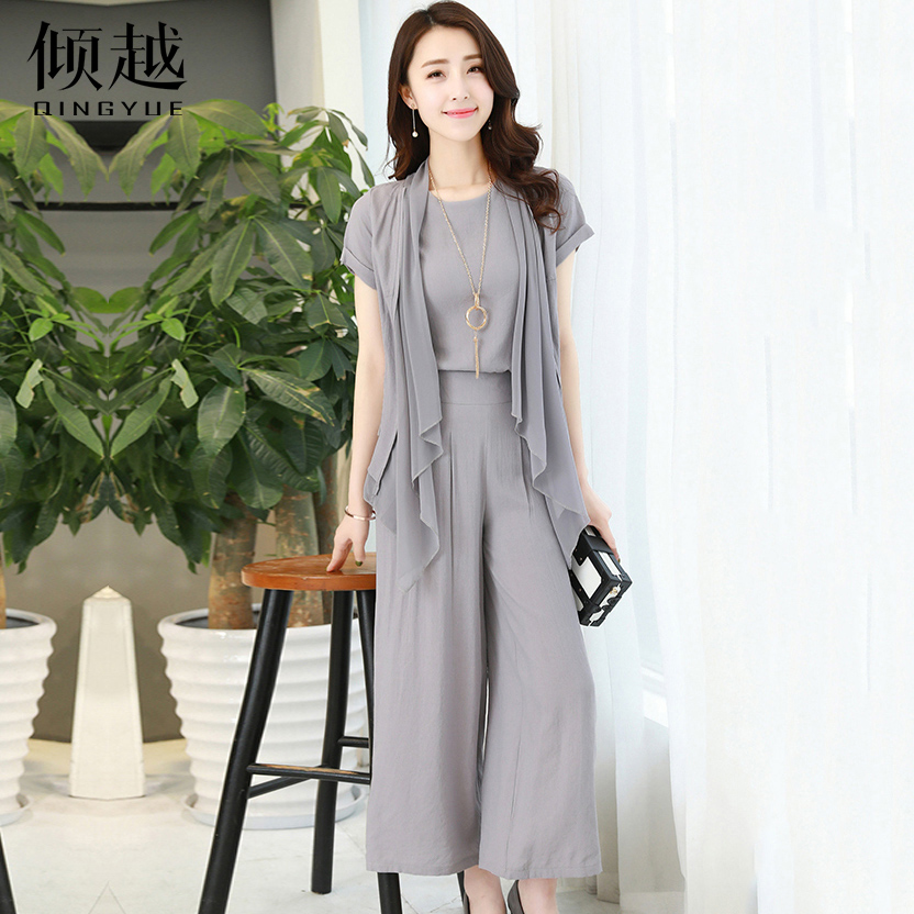 傾越套裝女2017夏裝新款韓版修身短袖雪紡百搭三件套九分褲闊腿褲
