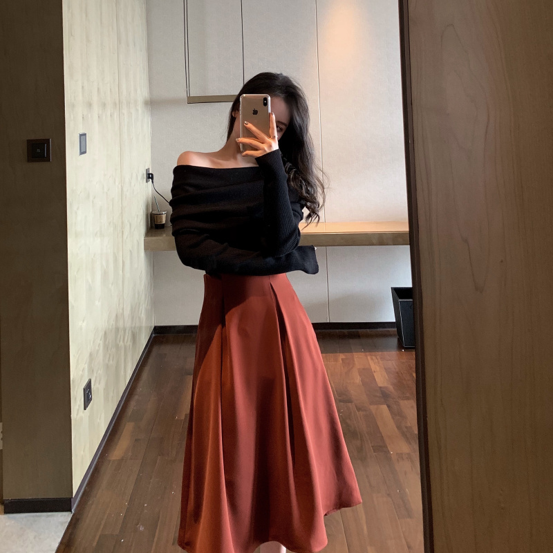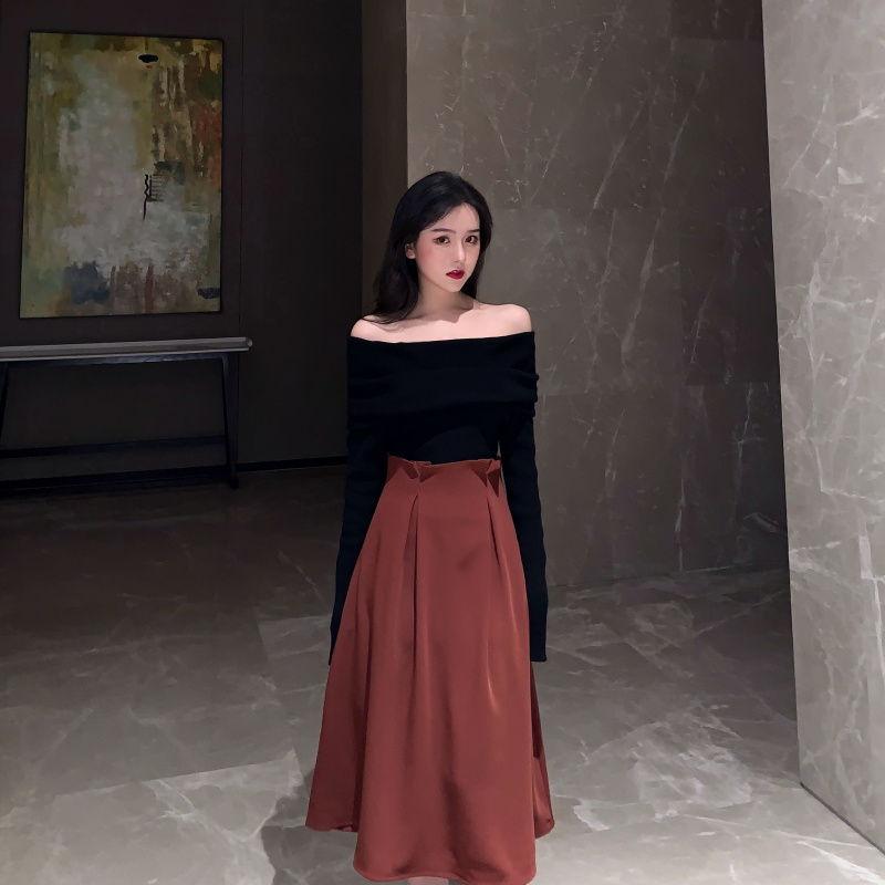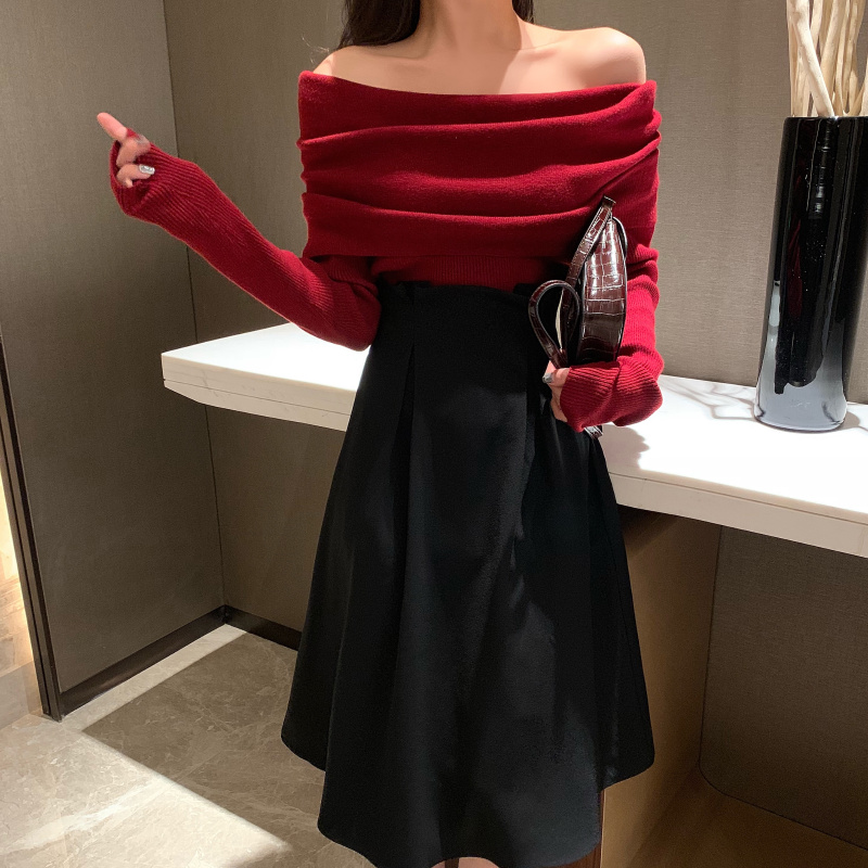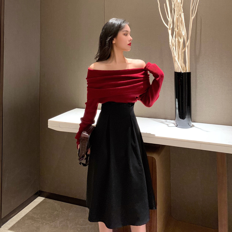 韓版慵懶風短款顯瘦套頭一字肩毛衣女+綁帶中長款顯瘦高腰半身裙