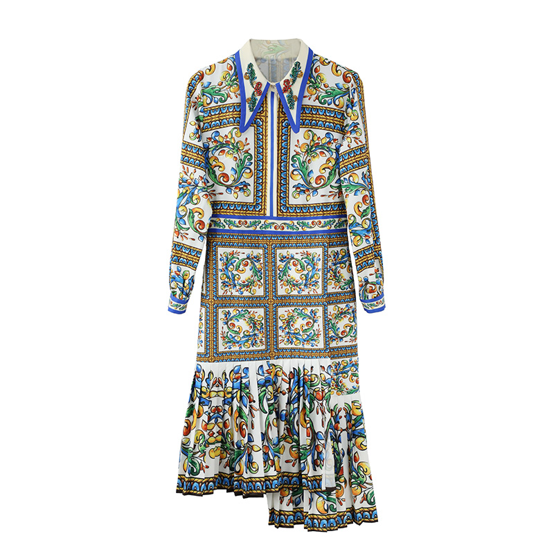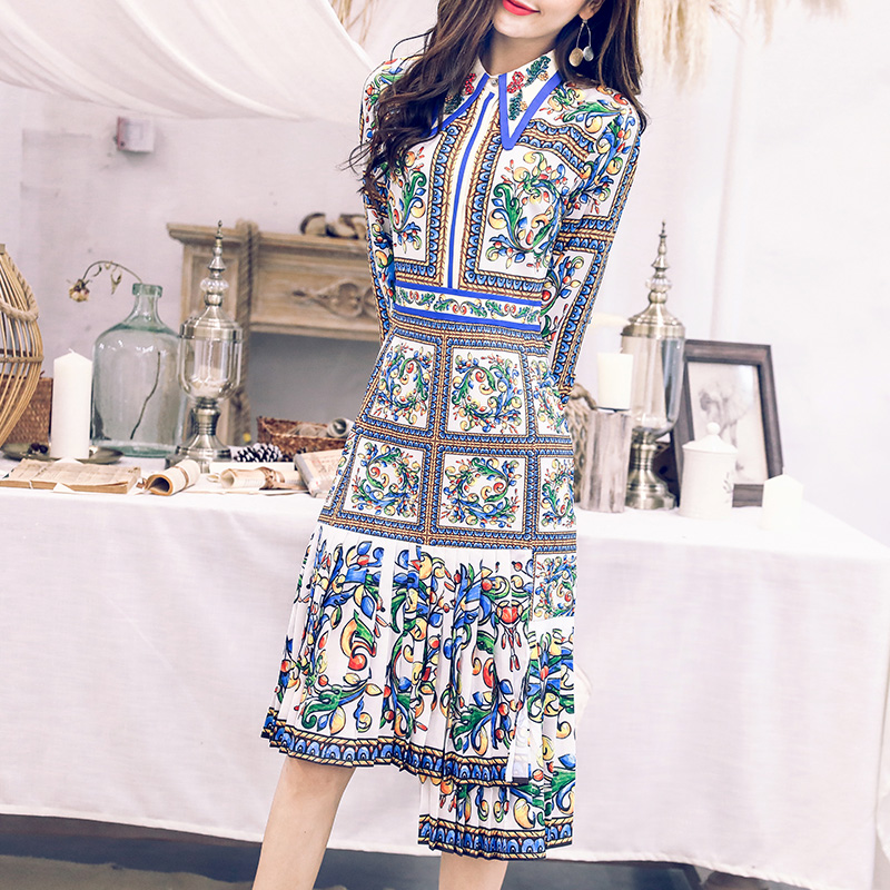 / 歐美名媛女裝2018秋季新款復古印花優雅氣質中長款不規則連衣裙潮
