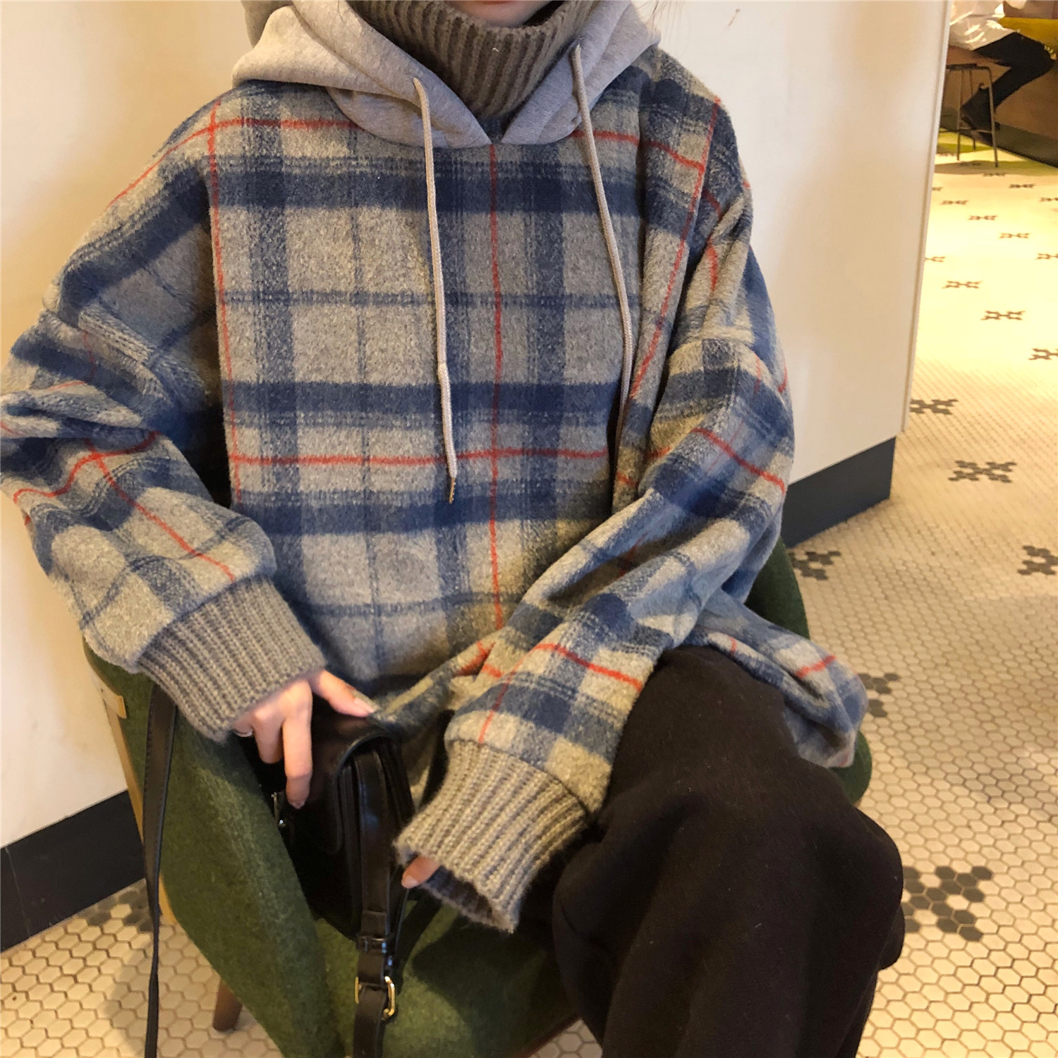 / 韓版拼接格子高領加絨加厚寬松衛衣女外套+呢子寬松蘿卜褲兩件套