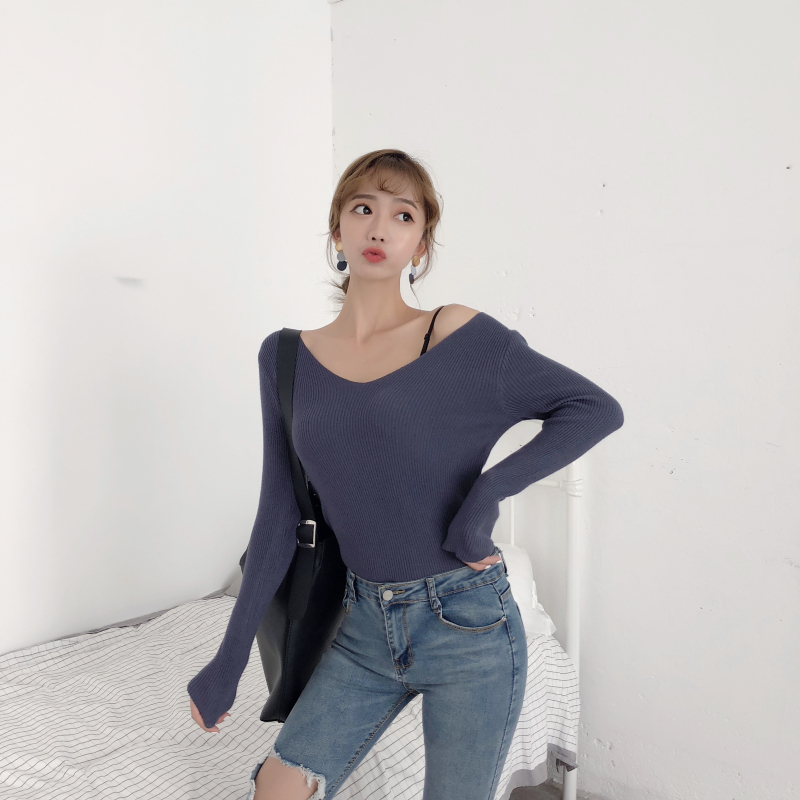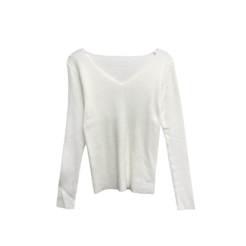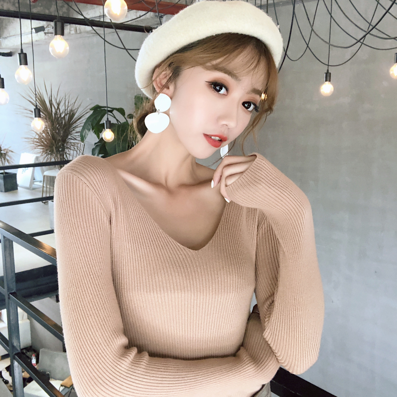 時尚新款純色V領長袖內搭針織衫打底毛衣套頭修身顯廋百搭女上衣