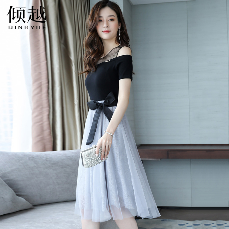 / 連衣裙女夏2017新款韓版時尚修身紗網拼接圓領條紋漏肩短袖中長裙