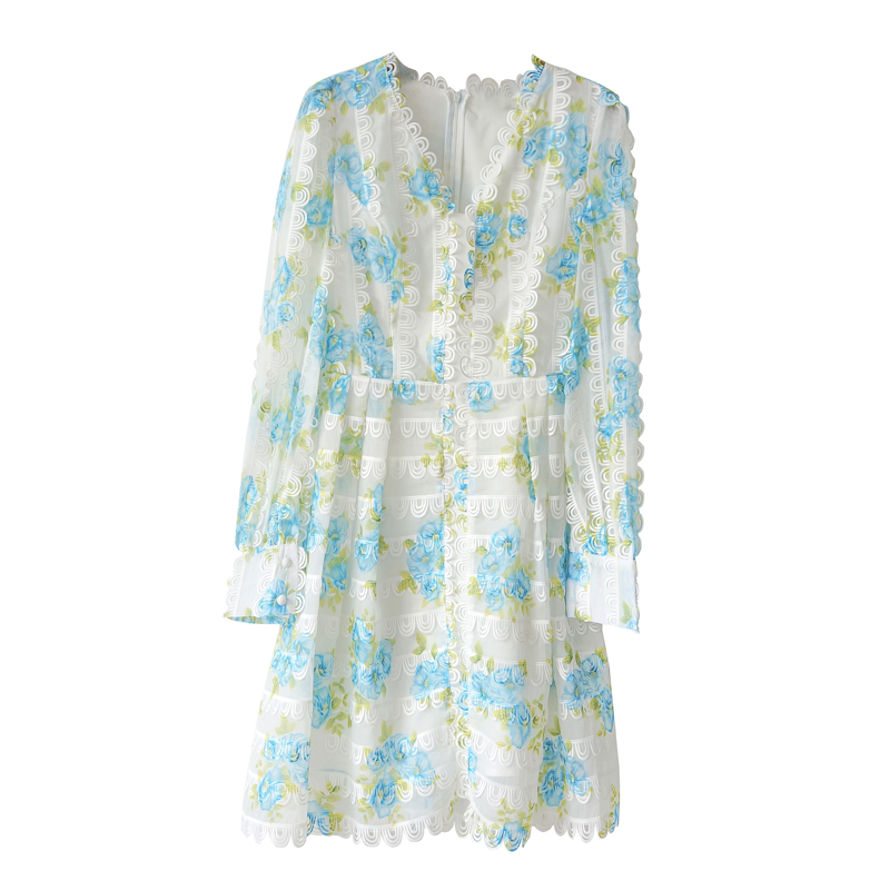 / 名媛氣質2018初秋新款少女復古鏤空繡花蕾絲花邊長袖印花連衣裙女