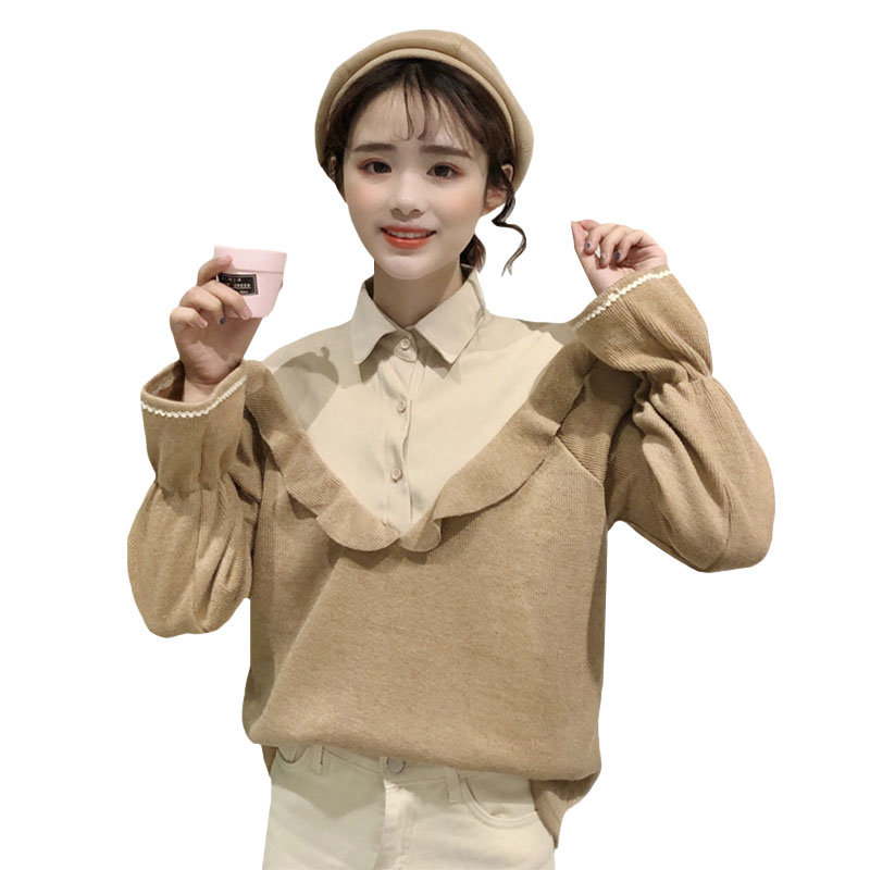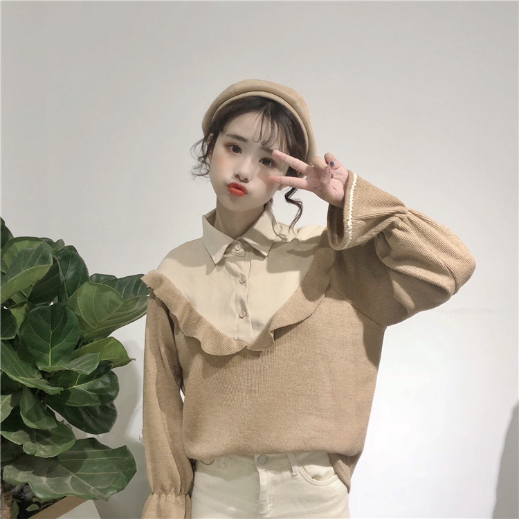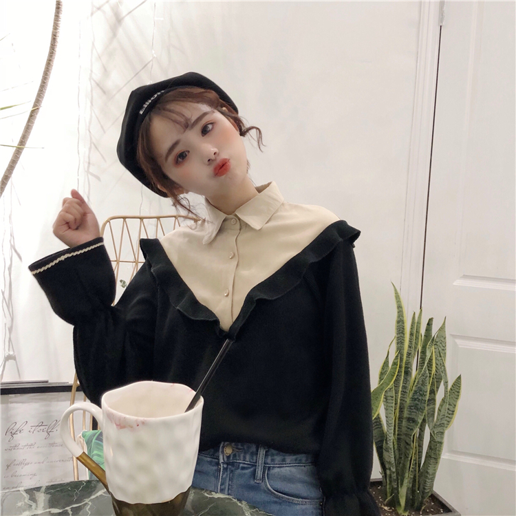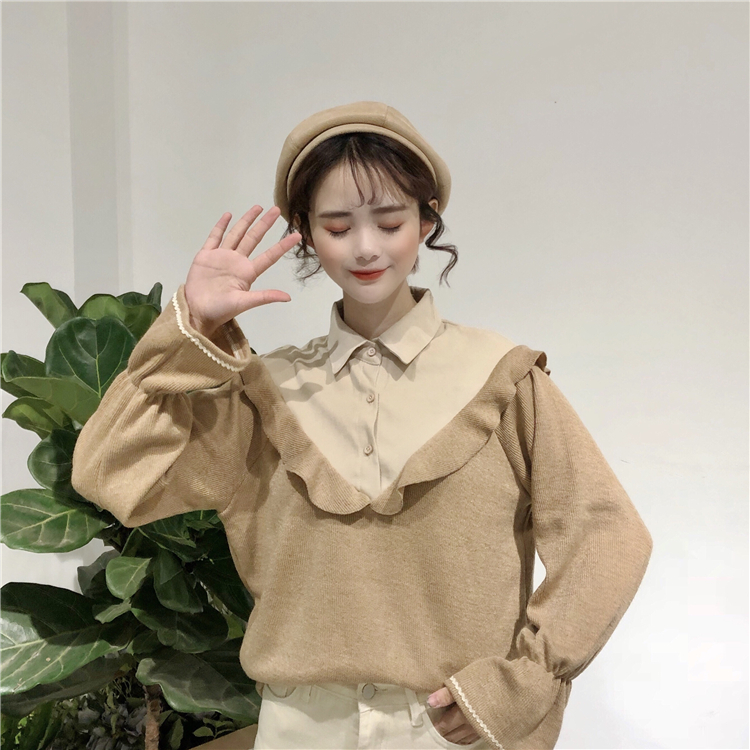 / 秋季女裝韓版chic復古拼接polo領襯衫寬松荷葉邊休閑長袖襯衣上衣