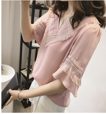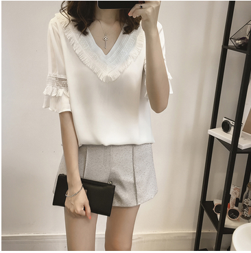 / 2017夏季新款韓版女裝V領喇叭袖雪紡衫女寬松打底衫上衣百搭小衫