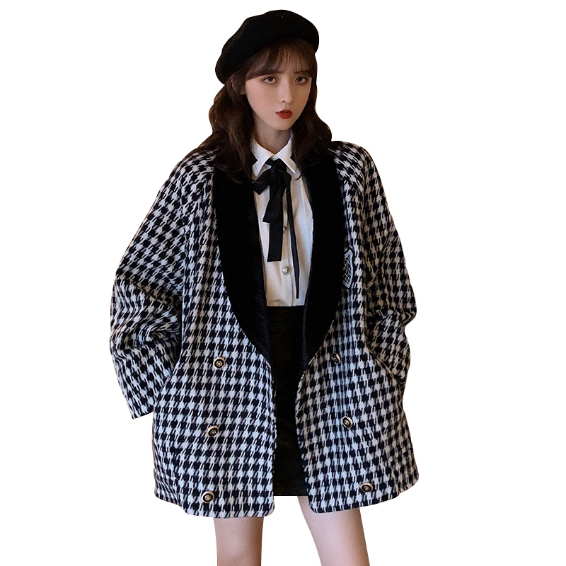/ 冬季新款寬松斗篷千鳥格毛呢大衣外套女領帶長袖襯衫港風時尚套裝
