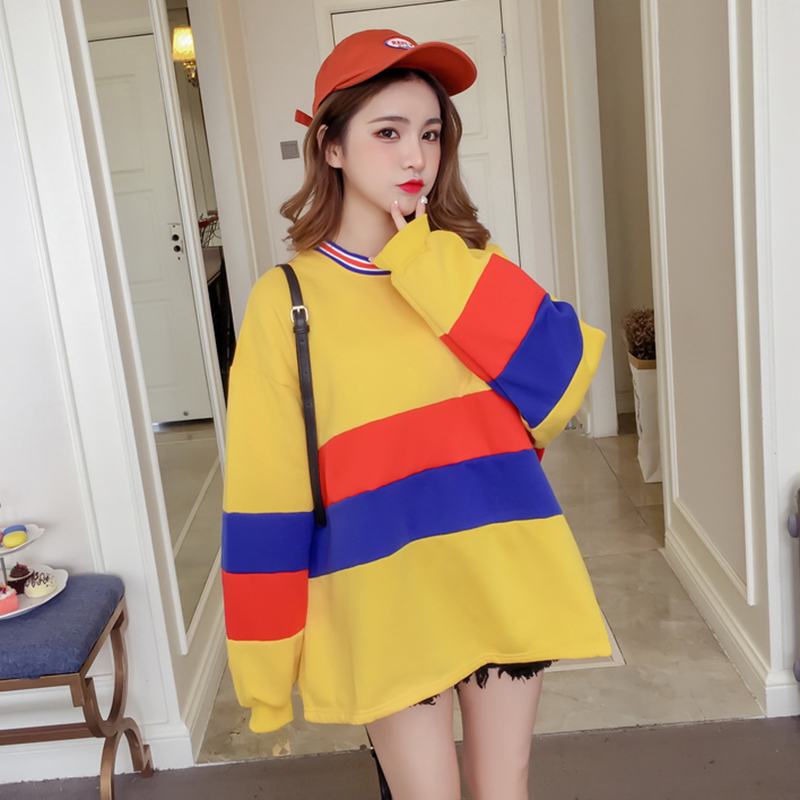 / 寬松時尚衛衣2018新款女秋冬裝港風撞色條紋上衣學生圓領長袖外套