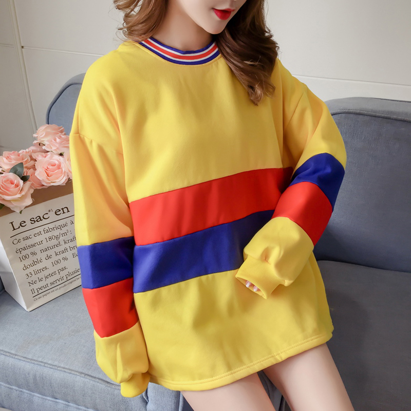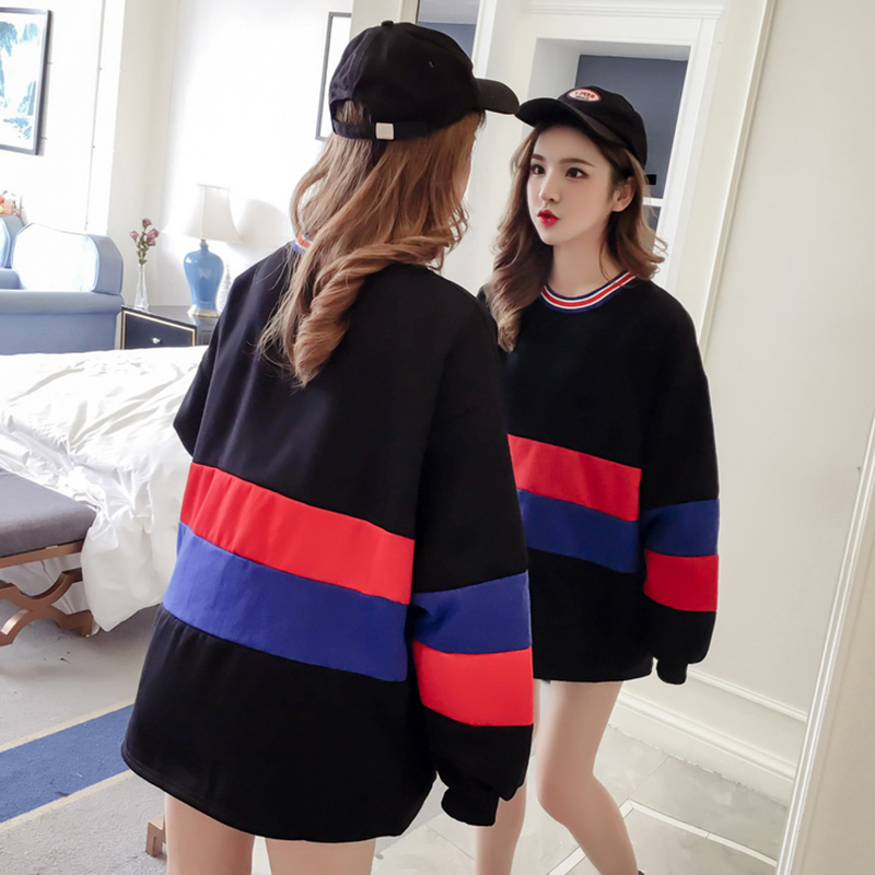 寬松時尚衛衣2018新款女秋冬裝港風撞色條紋上衣學生圓領長袖外套