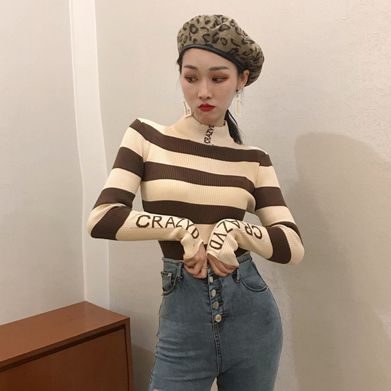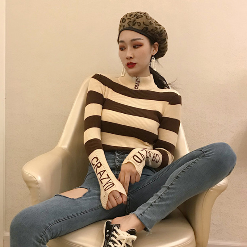 / 氣質高領修身顯瘦針織打底衫秋冬女裝新款復古風條紋長袖T恤上衣
