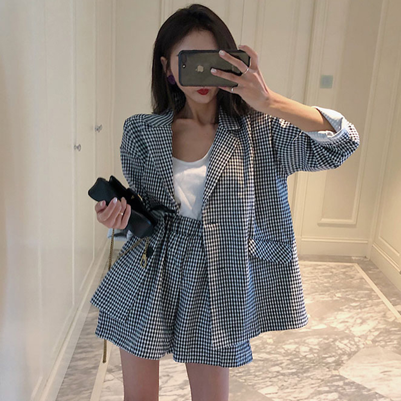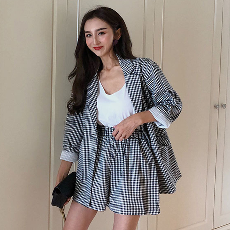 御姐套裝女秋冬新款復古風格子翻領西裝外套高腰顯瘦寬松闊腿短褲